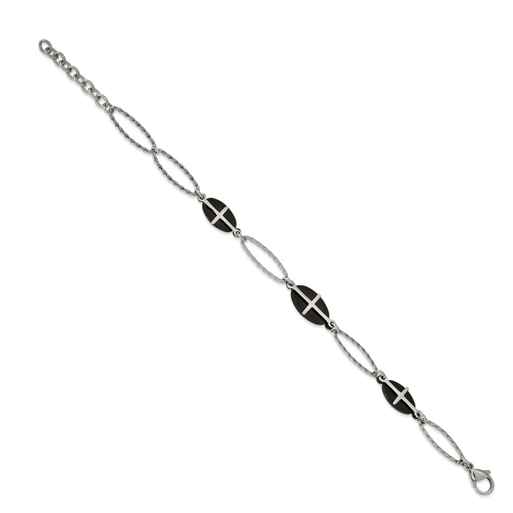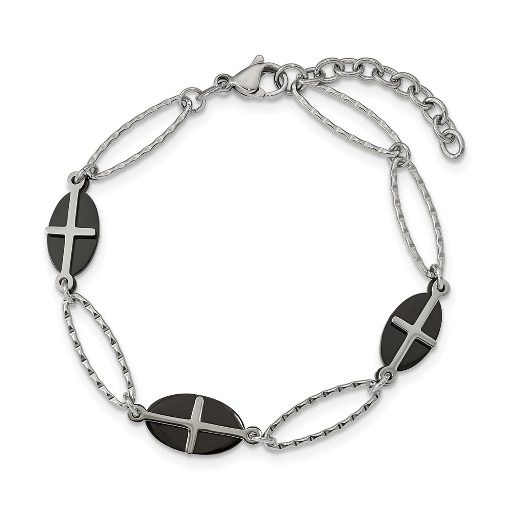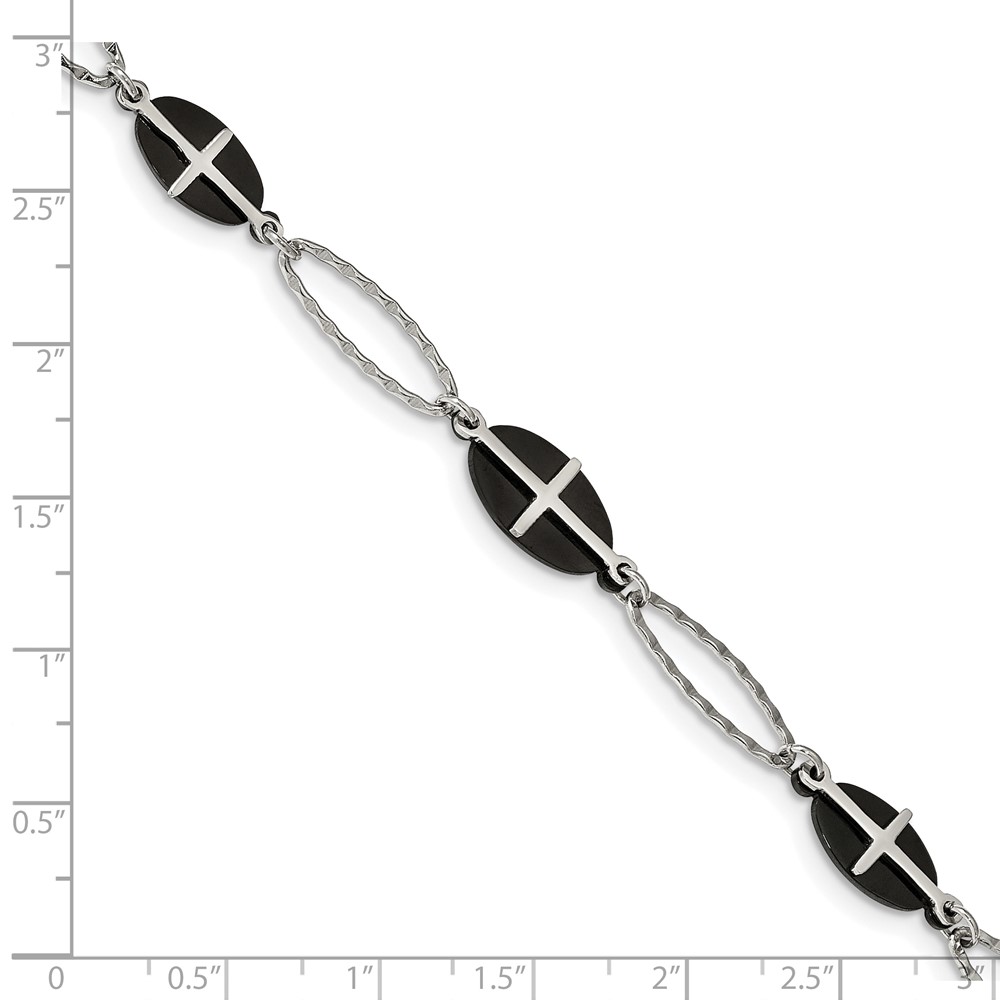 Stainless Steel Polished Black IP-plated 7in w/1in ext. Cross Bracelet
