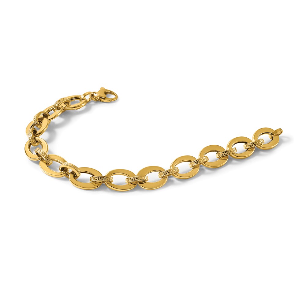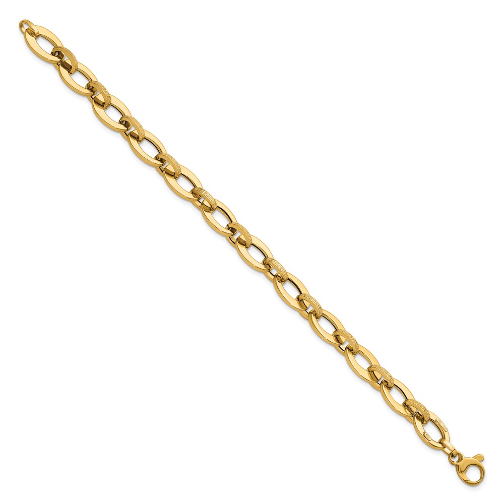 14K Polished and Textured Greek Key Etched 10mm Fancy Oval Link 7.75 inch Bracelet