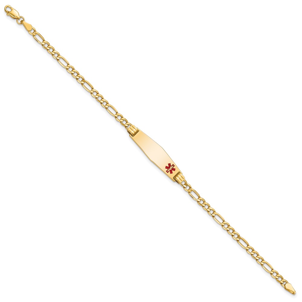 14K Medical Solid Chain/Solid Plate 34x6mm Centered Red Enamel Flat Figaro Link 7 inch ID Bracelet