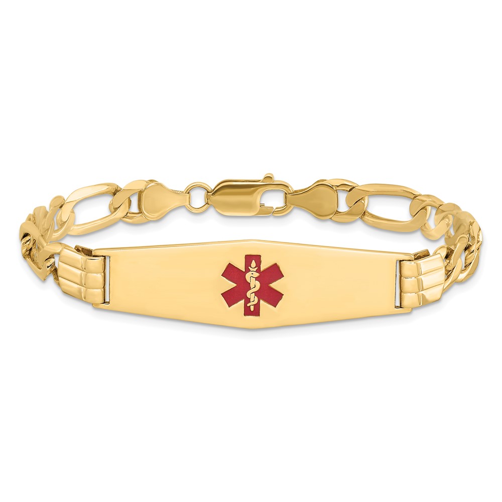 14K Medical Solid Chain/Solid Plate Soft Diamond Shape 40x12mm Centered Red Enamel Flat Figaro Link 7 inch ID Bracelet