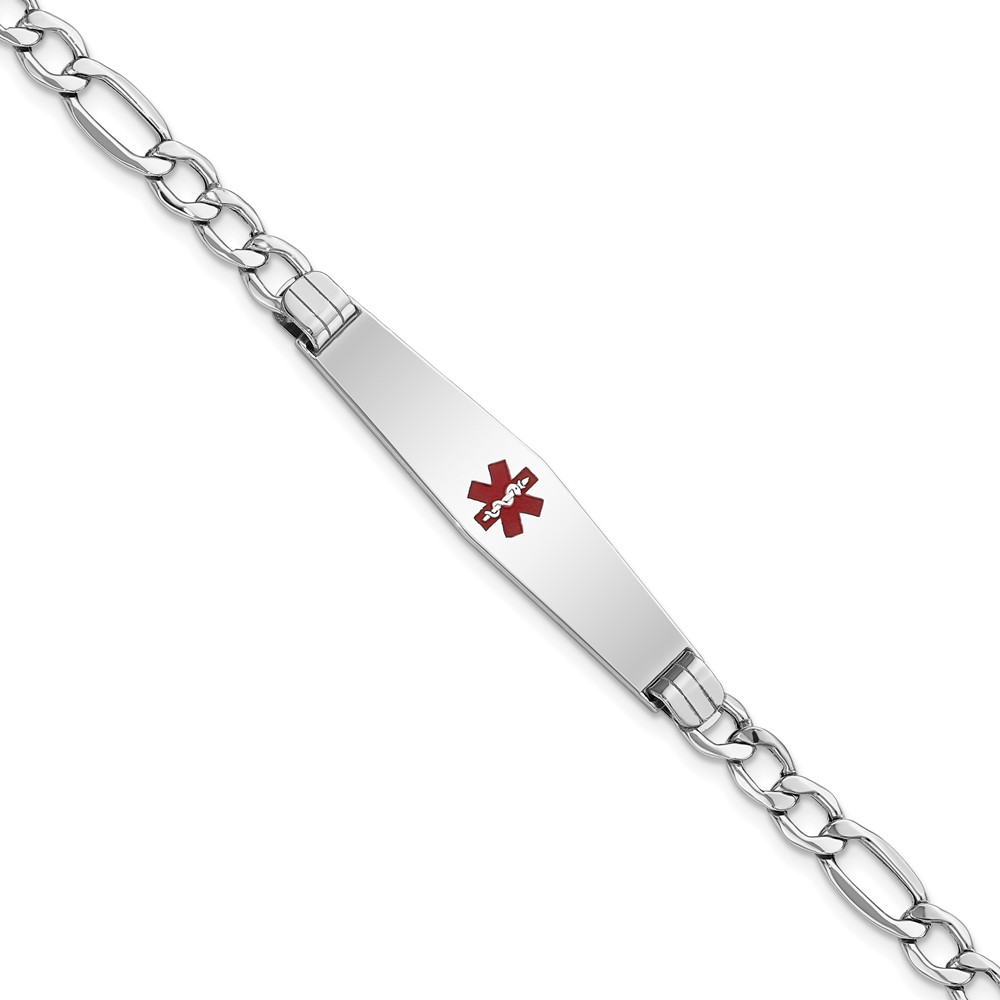 14K White Gold Medical Semi-Solid Chain/Solid Plate Soft Diamond Shape 37x9mm Centered Red Enamel Figaro Link 7 inch ID Bracelet