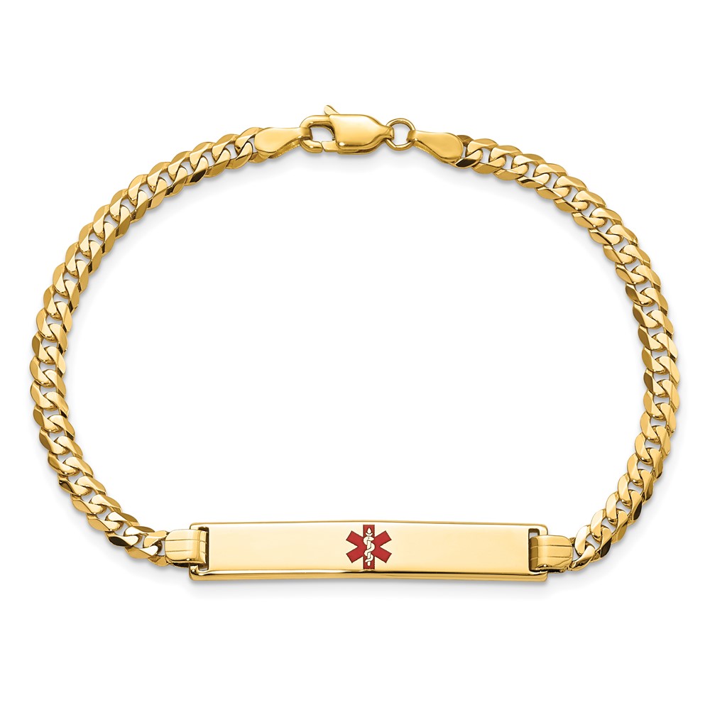 14K Medical Solid Chain/Solid Plate 34x6mm Centered Red Enamel Flat Curb Link 8 inch ID Bracelet