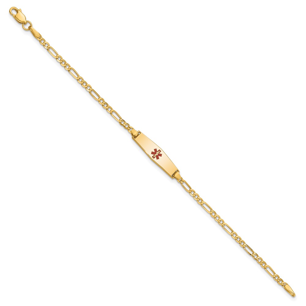 14k Medical Solid Chain/Solid Plate 20x5mm Soft Diamond Shape Centered Red Enamel Figaro Link 6 inch Baby/Child ID Bracelet