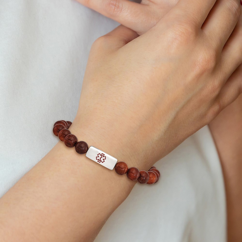 Stainless Steel Polished with Enamel Medical ID Padauk Wood Bracelet