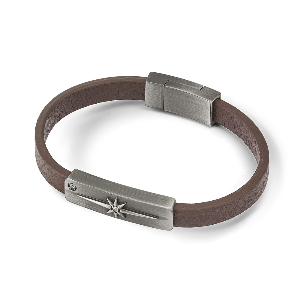 Chisel Stainless Steel Antiqued Bronze-plated with CZ Starburst Brown Leather 8 inch Bracelet