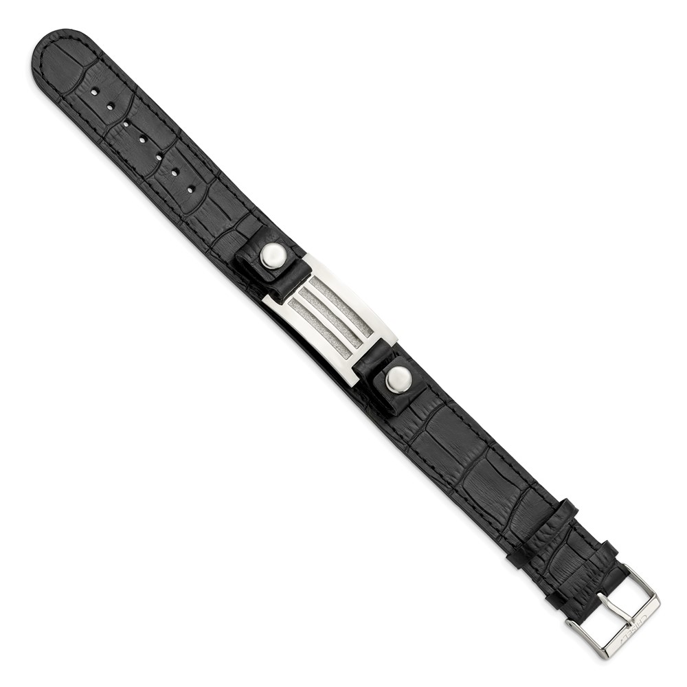 Stainless Steel Polished Black Leather w/Stone Finish 9.5in Bracelet