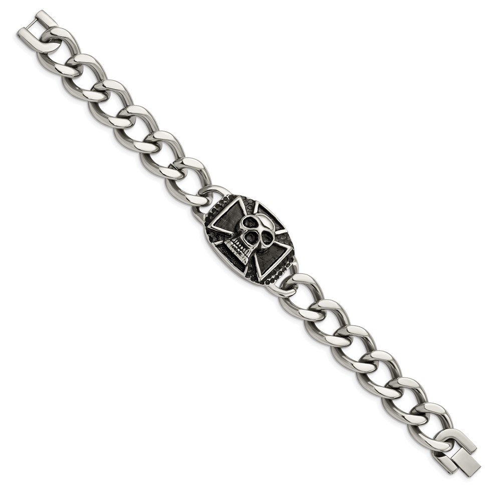 Chisel Stainless Steel Antiqued and Polished Skull 9 inch Curb Bracelet