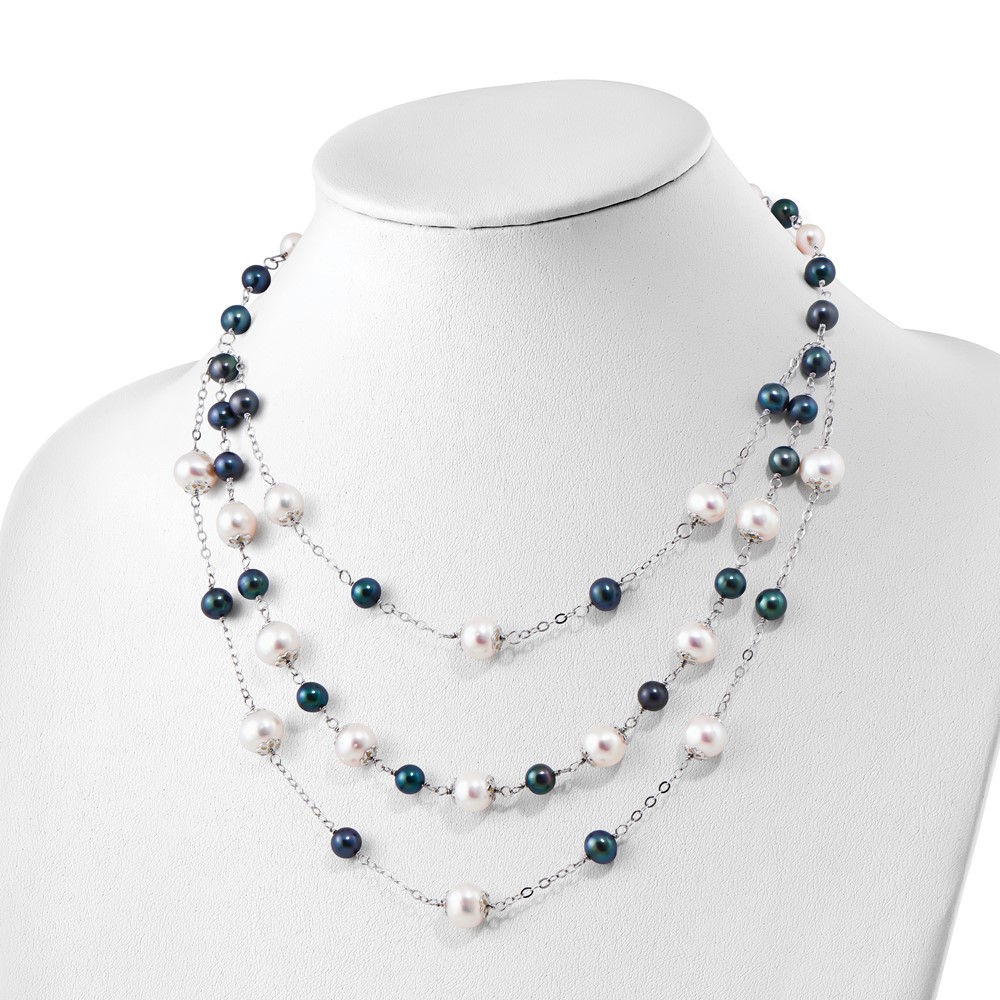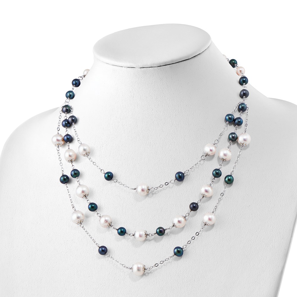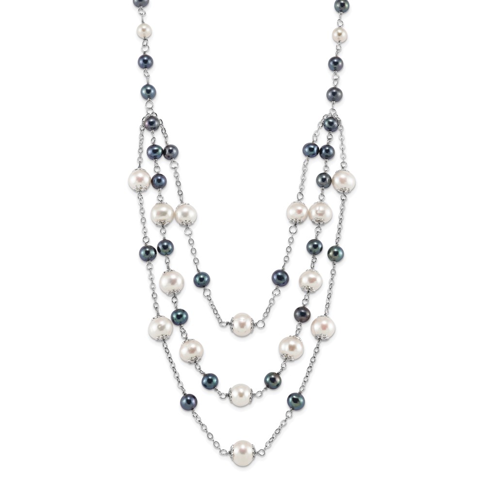 Sterling Silver Rhodium-plated 6-10mm White and Black Freshwater Cultured Pearl Layered 17 inch with 2 inch Extension Necklace