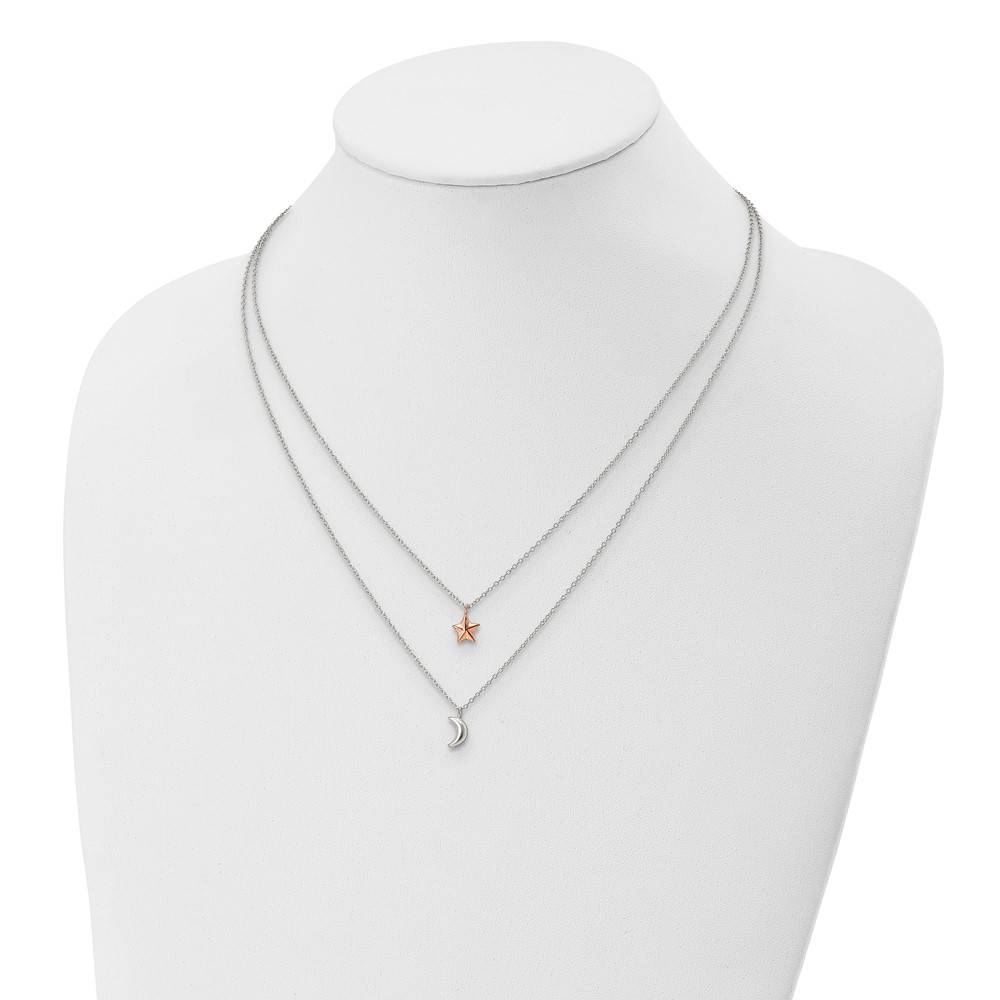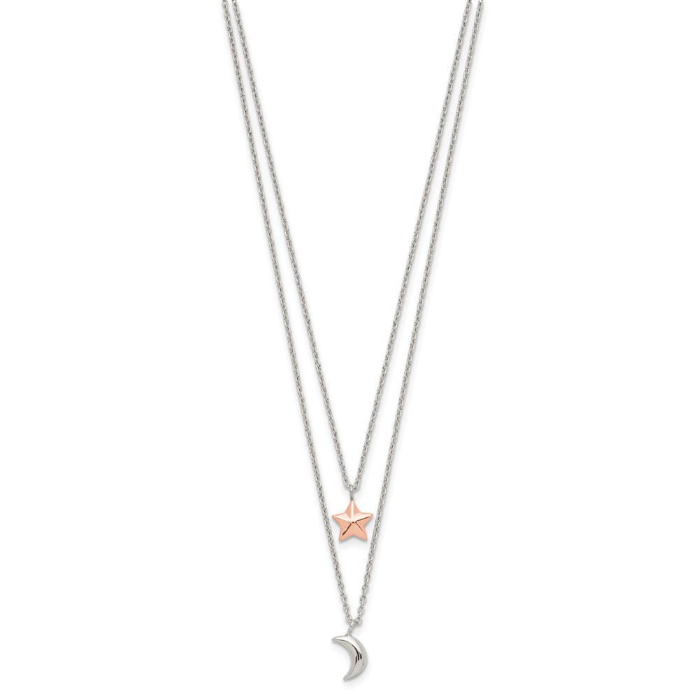 Sterling Silver Rose-Tone 2-strand Moon and Star w/1in ext Necklace