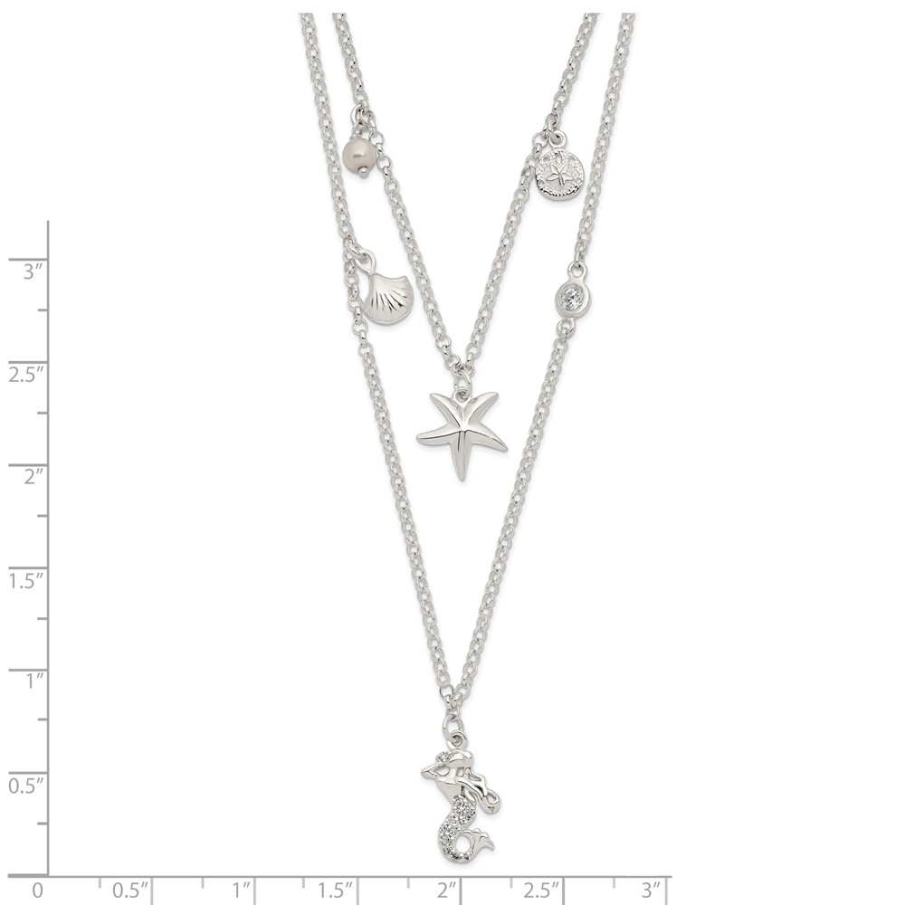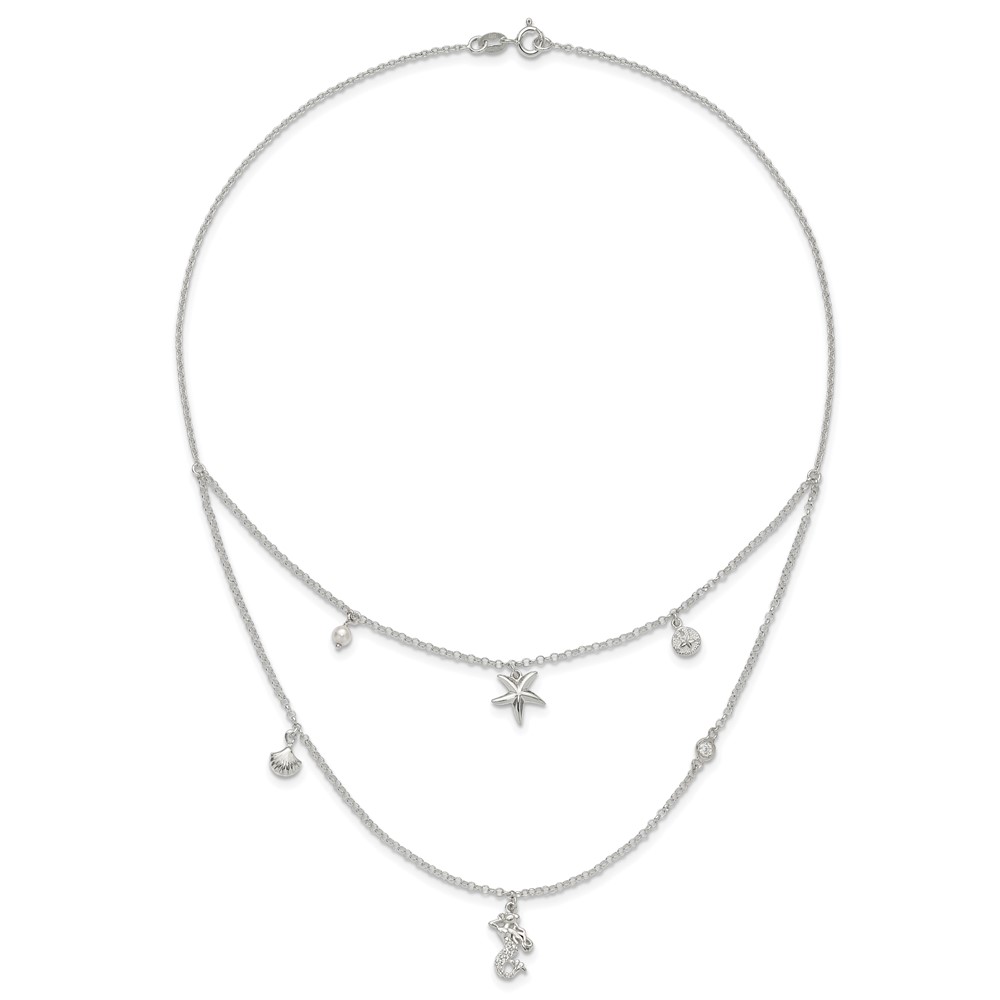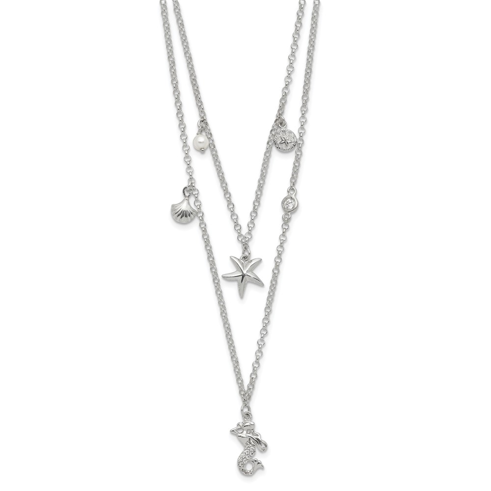 Sterling Silver CZ 7 Imitation Pearl Beach Theme 2-Strand Necklace