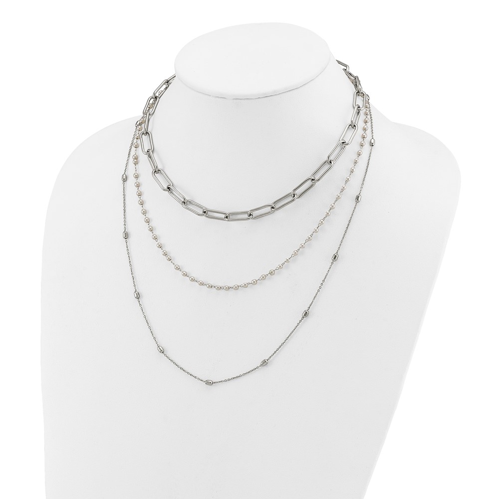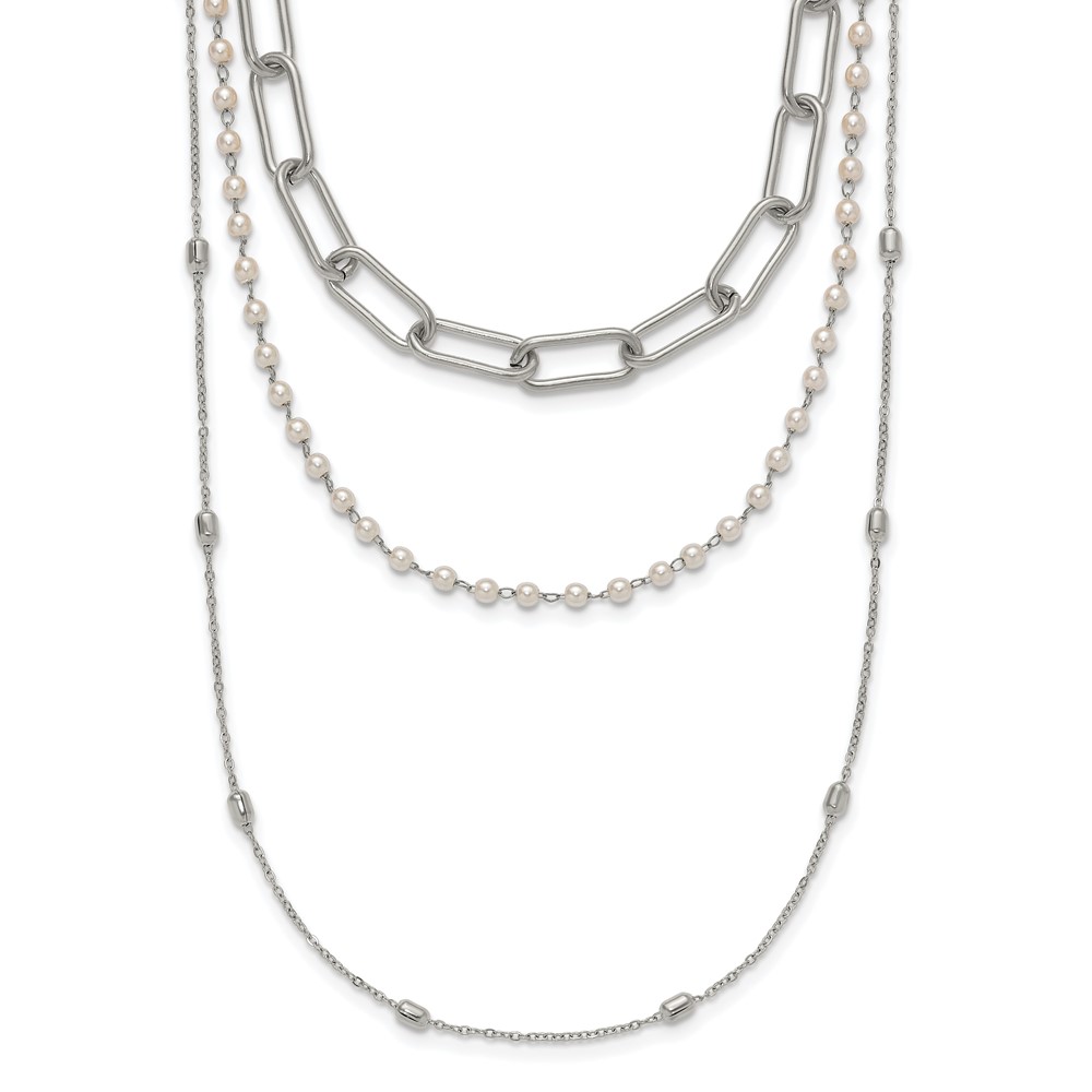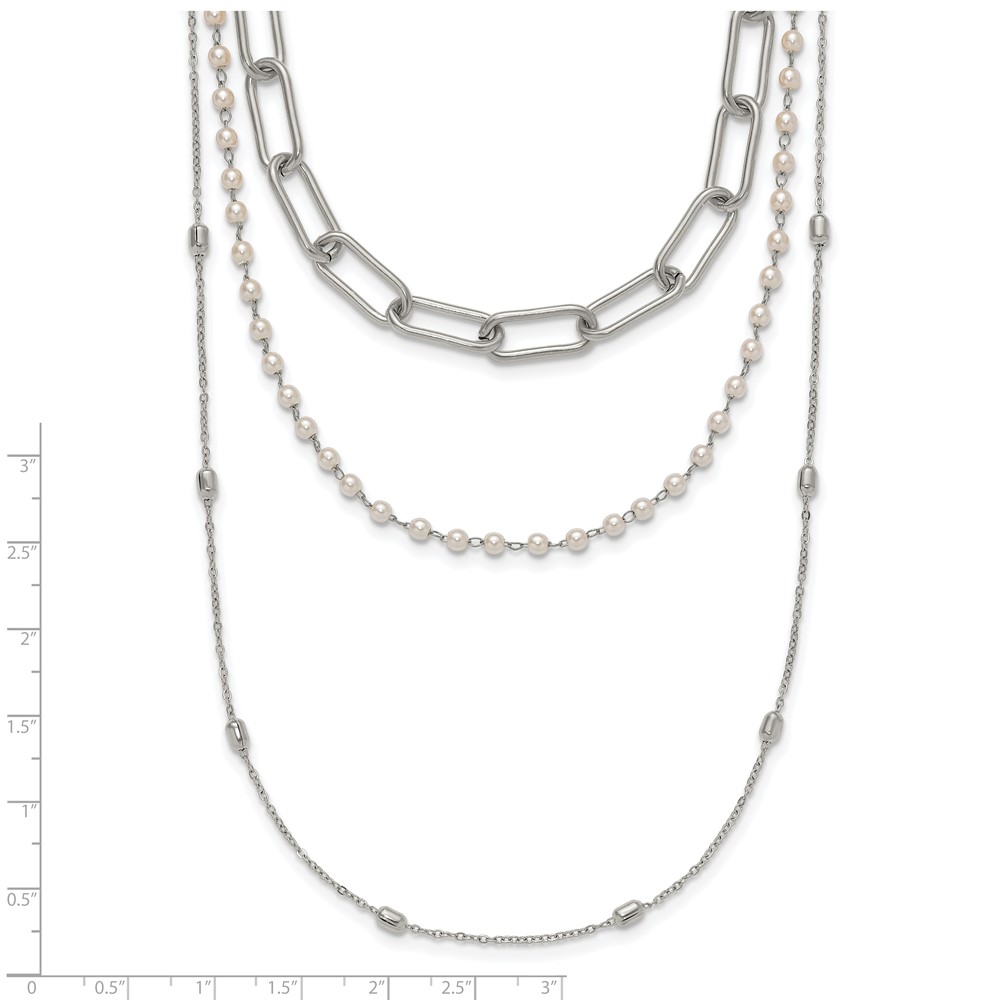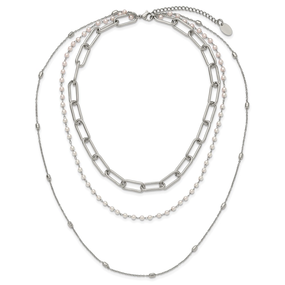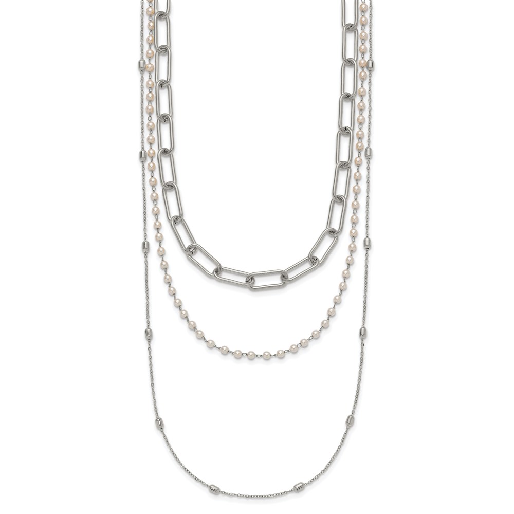"Chisel Stainless Steel Polished Paperclip Link, Beaded Chain and with White Freshwater Cultured Pearl Layered 13.5 inch Plus a 2 inch Extension Necklace"