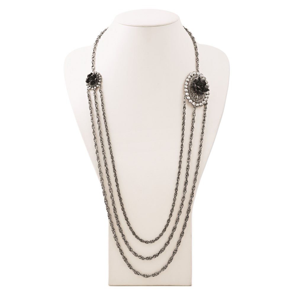 1928 Silver-tone Black Flowers & Crystal Layered Necklace
