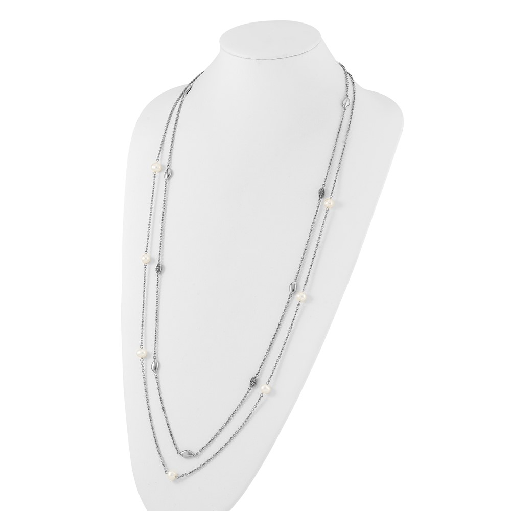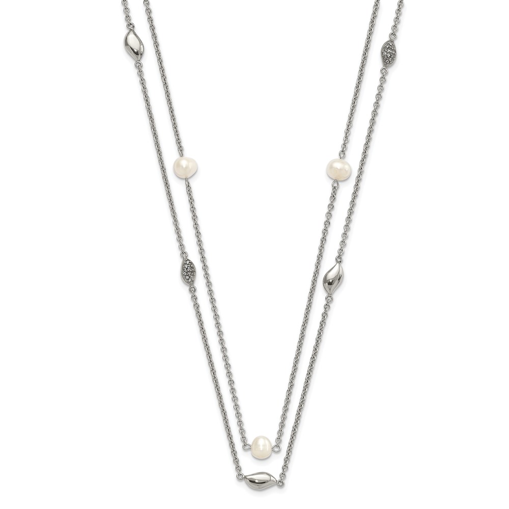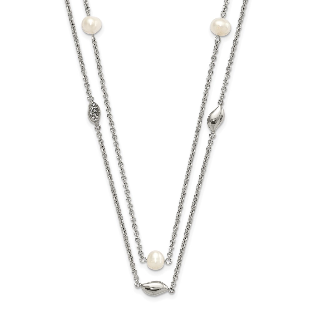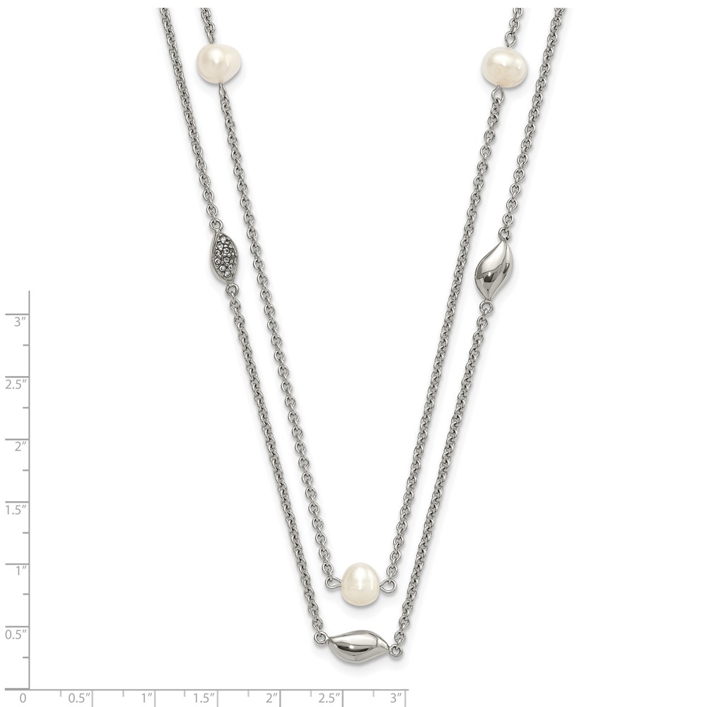 Stainless Steel Polished 2 Strand Freshwater Cultured Pearls & CZ w/ 2in ext. Necklace