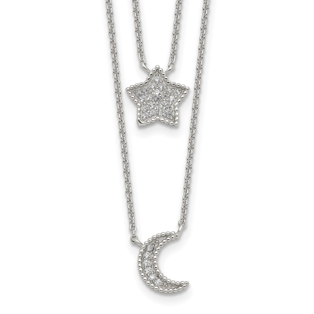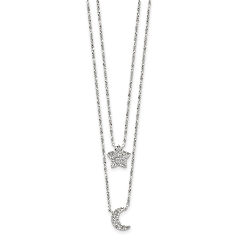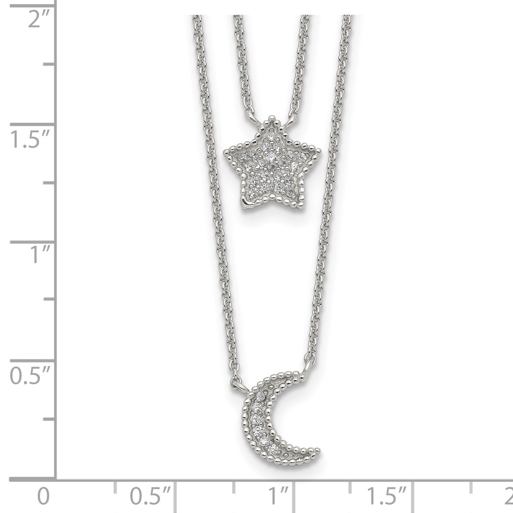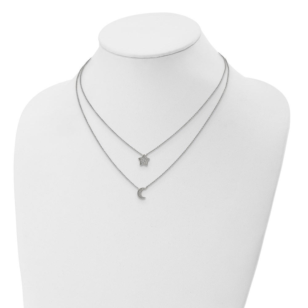Sterling Silver RH-plated Polished CZ Moon and Star Double Strand Necklace