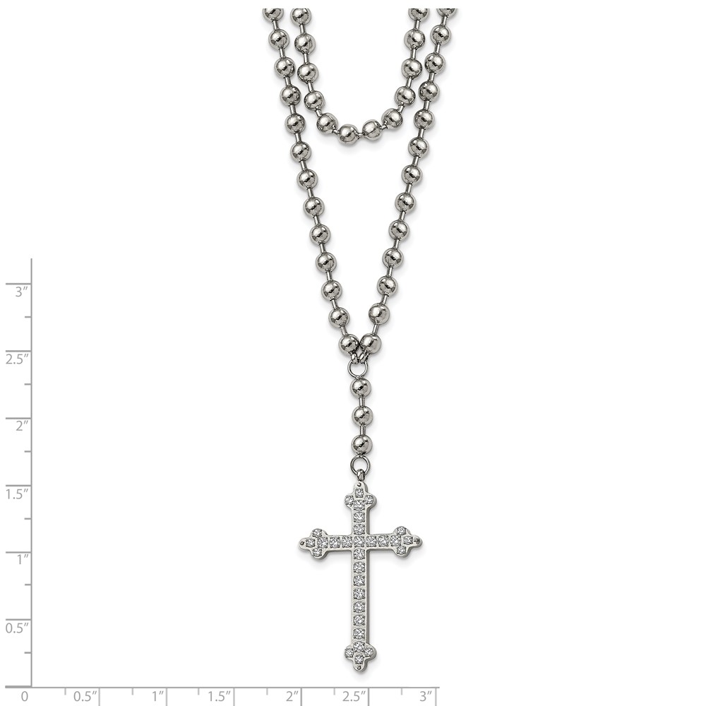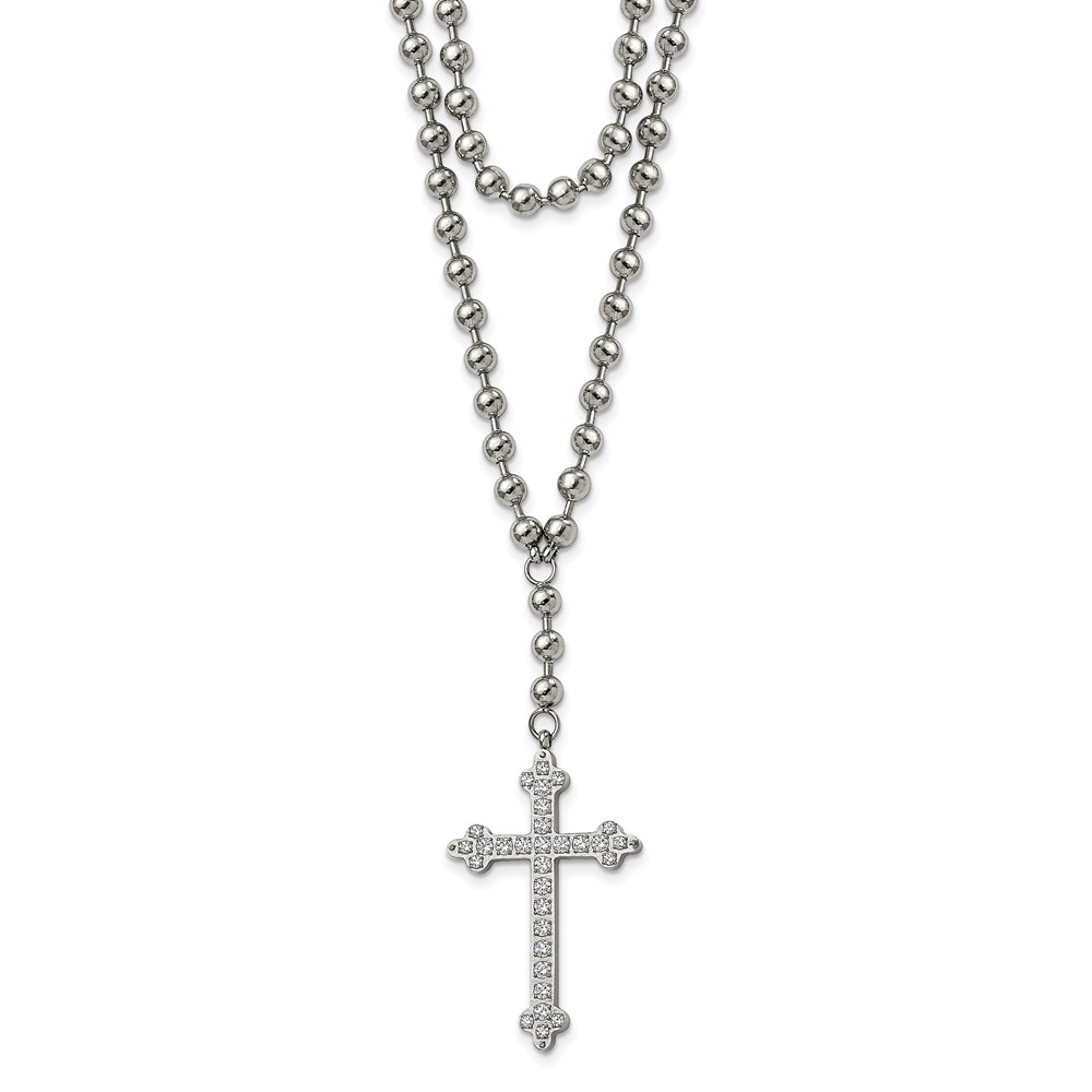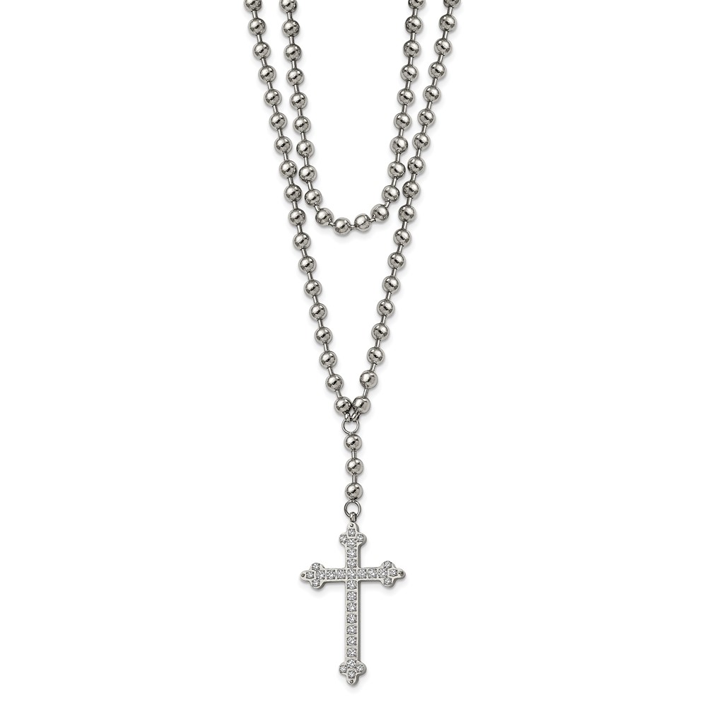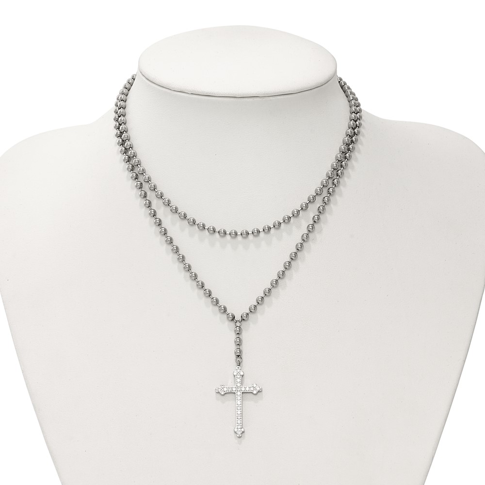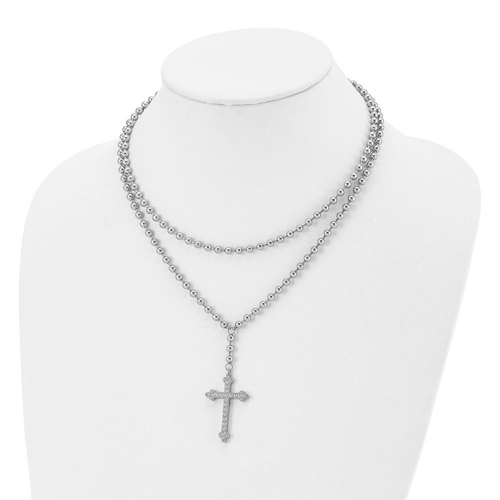 Stainless Steel Polished Cross w/Crystal Two Strand Beaded 16in Necklace