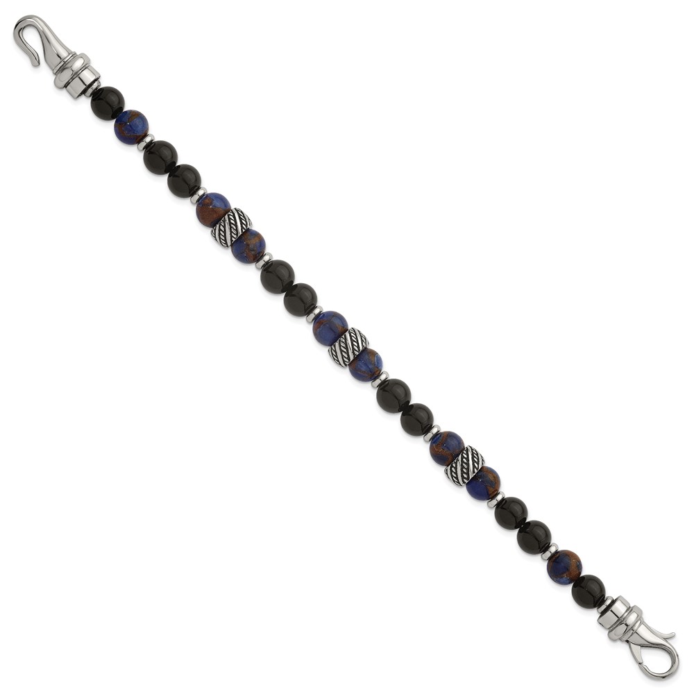 Stainless Steel Polished Antiq Blue Golden/Black Onyx Bead 8.5in Bracelet
