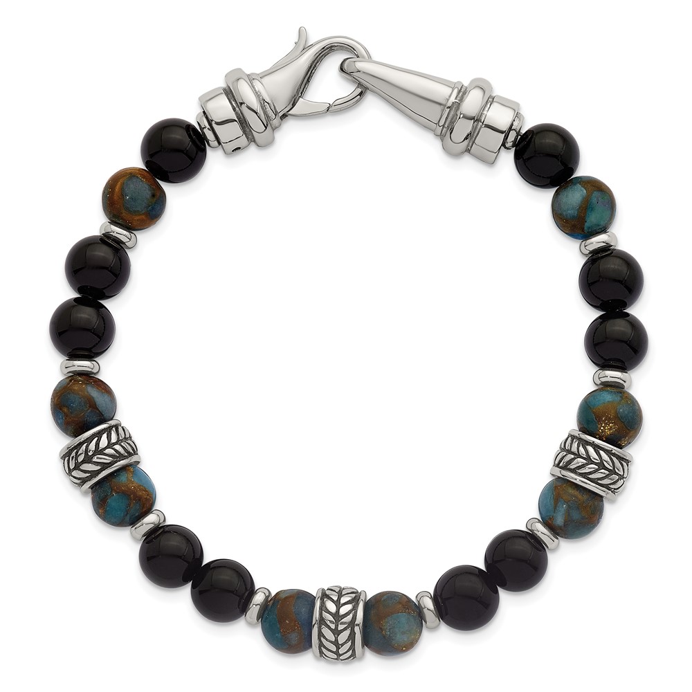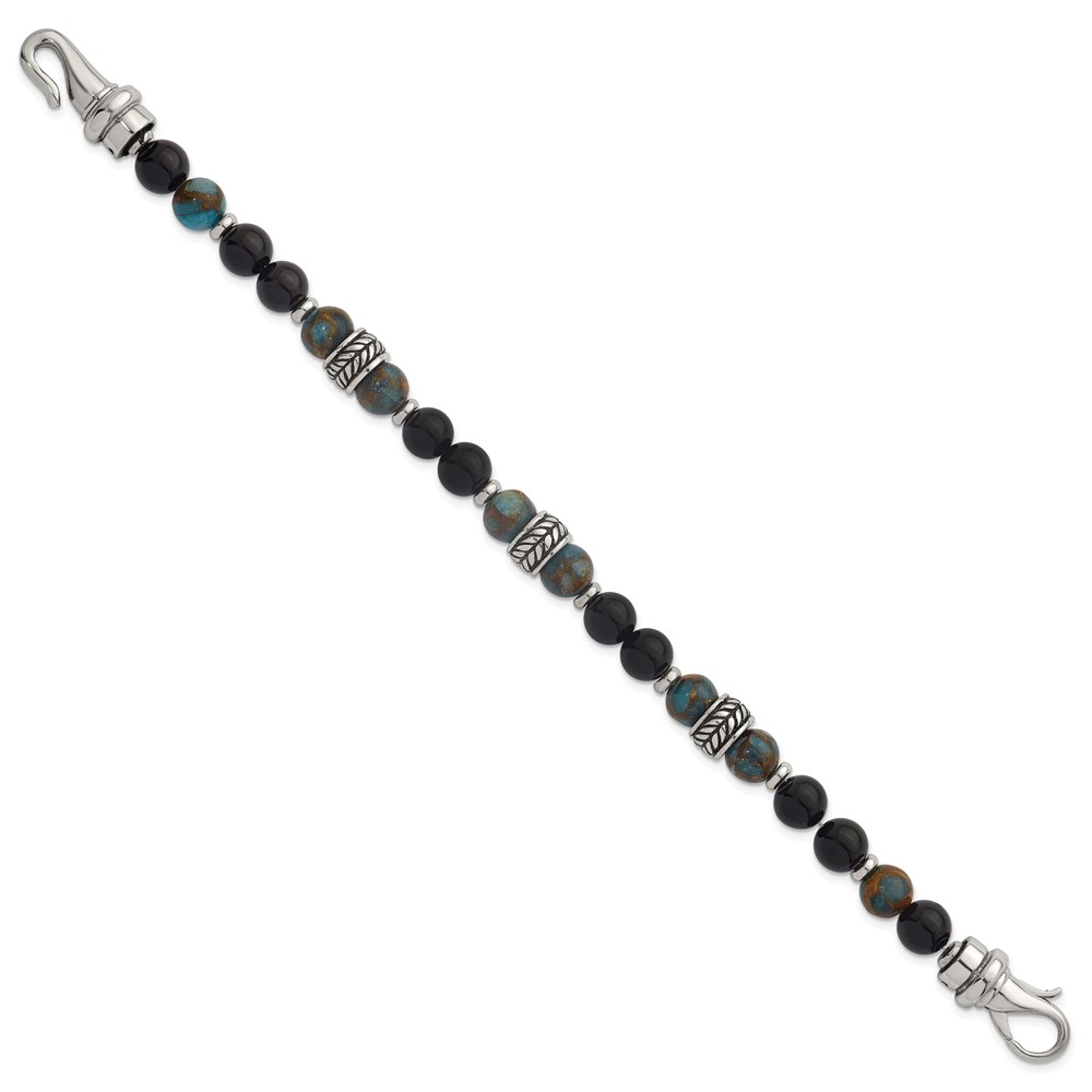 Stainless Steel Polished Antiq Lt Blue Gold/Black Onyx Bead 8.5in Bracelet