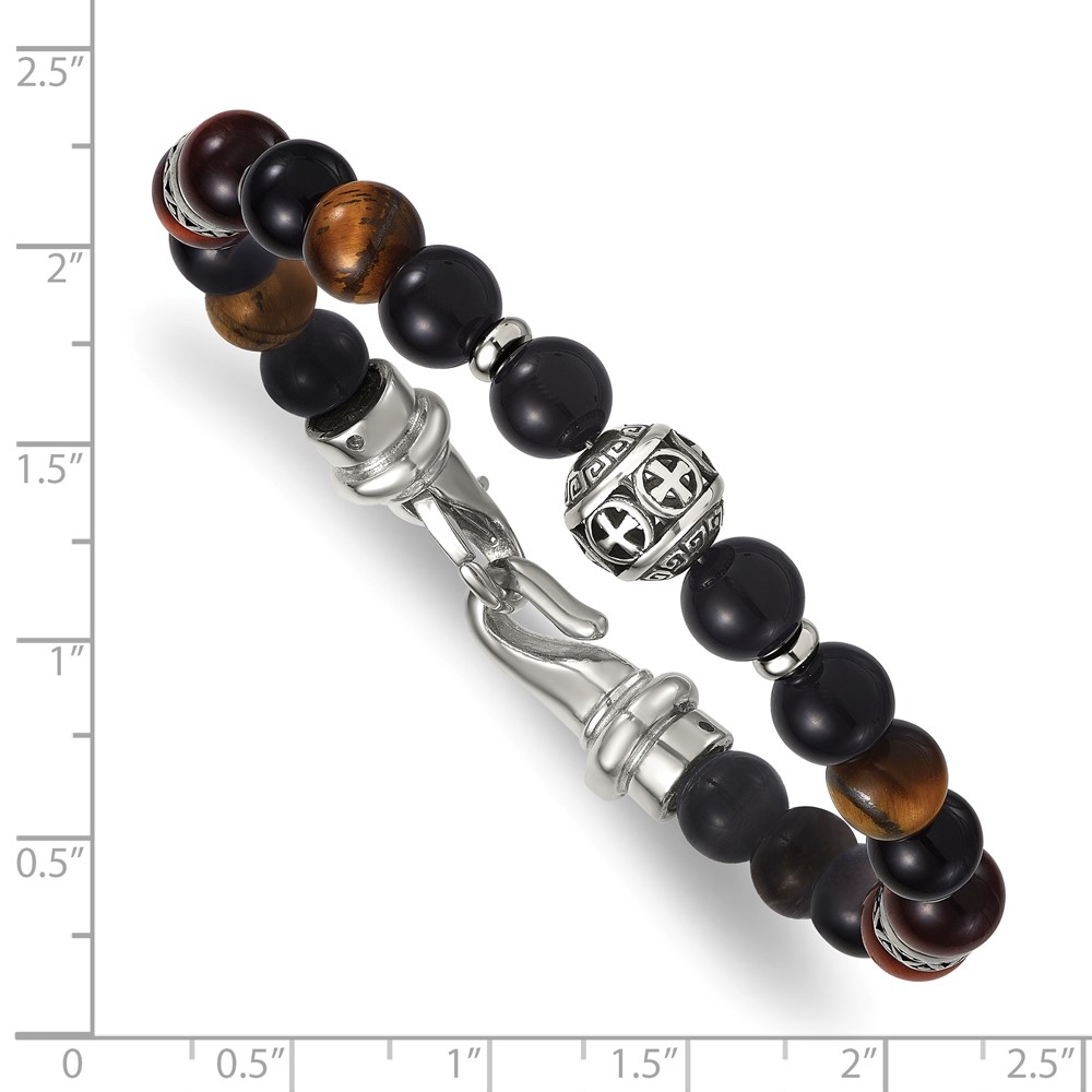 Stainless Steel Polished Tiger's Eye and Black Onyx 8.5in Bracelet