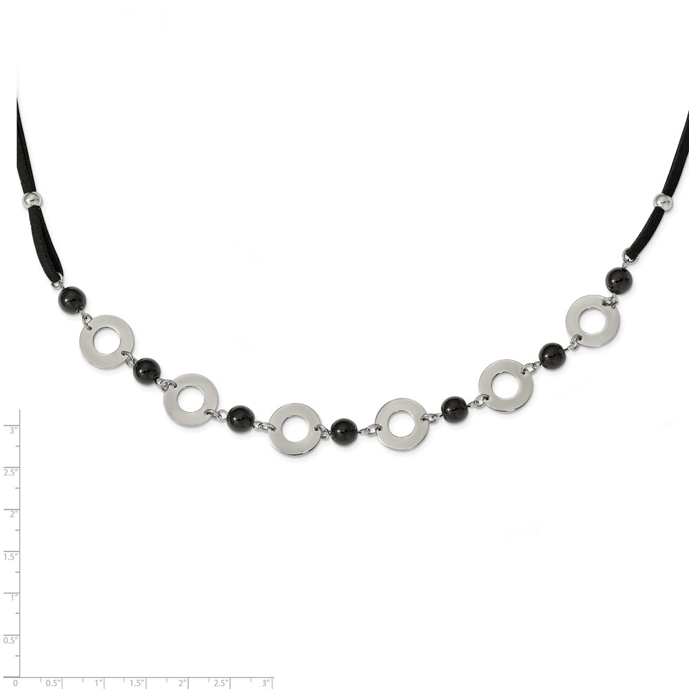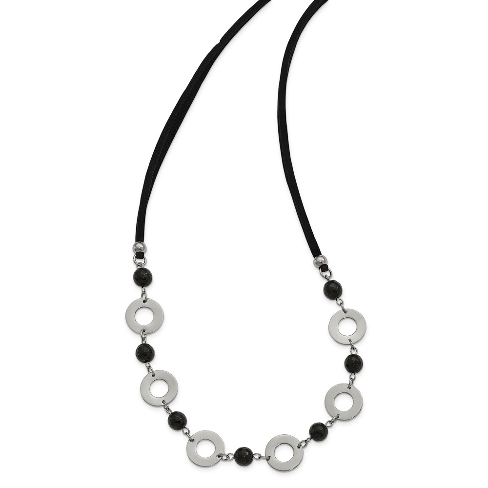 Stainless Steel Polished w/Black Agate w/1.5in ext Leather Cord Necklace