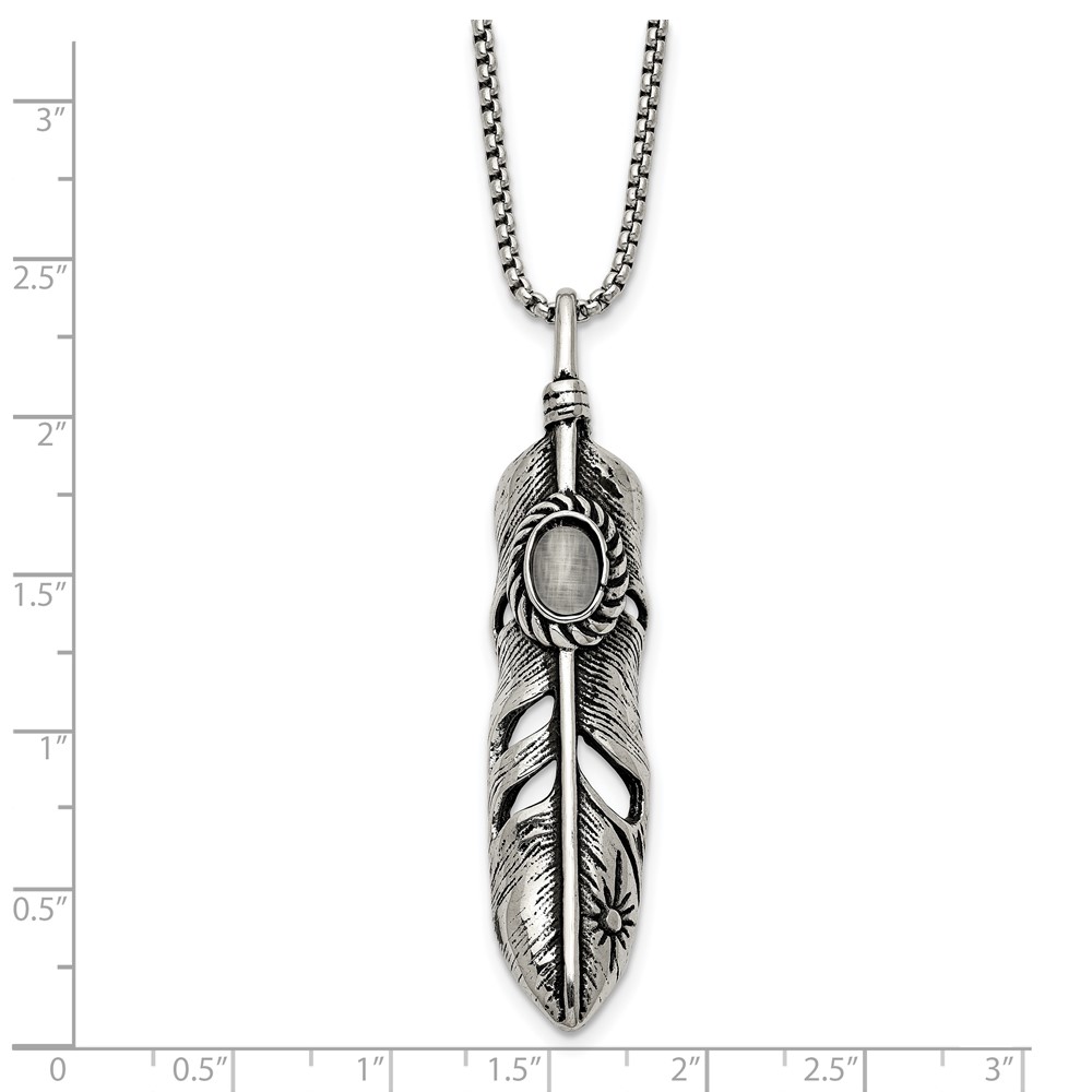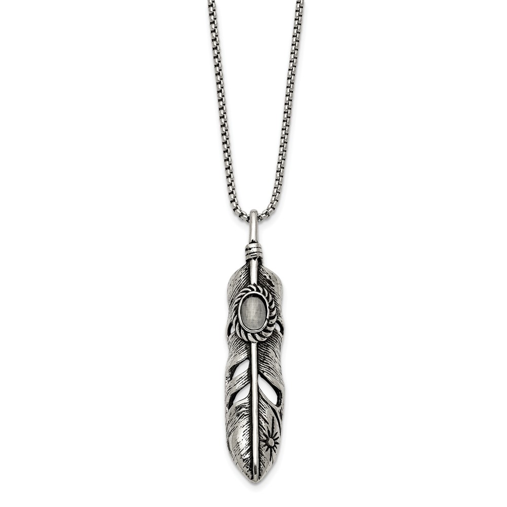 Chisel Stainless Steel Antiqued and Polished with White Cat's Eye Feather Pendant on a 24 inch Box Chain Necklace