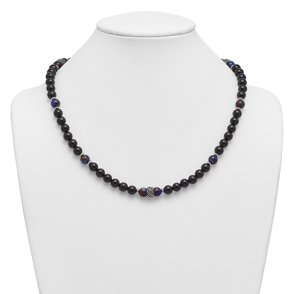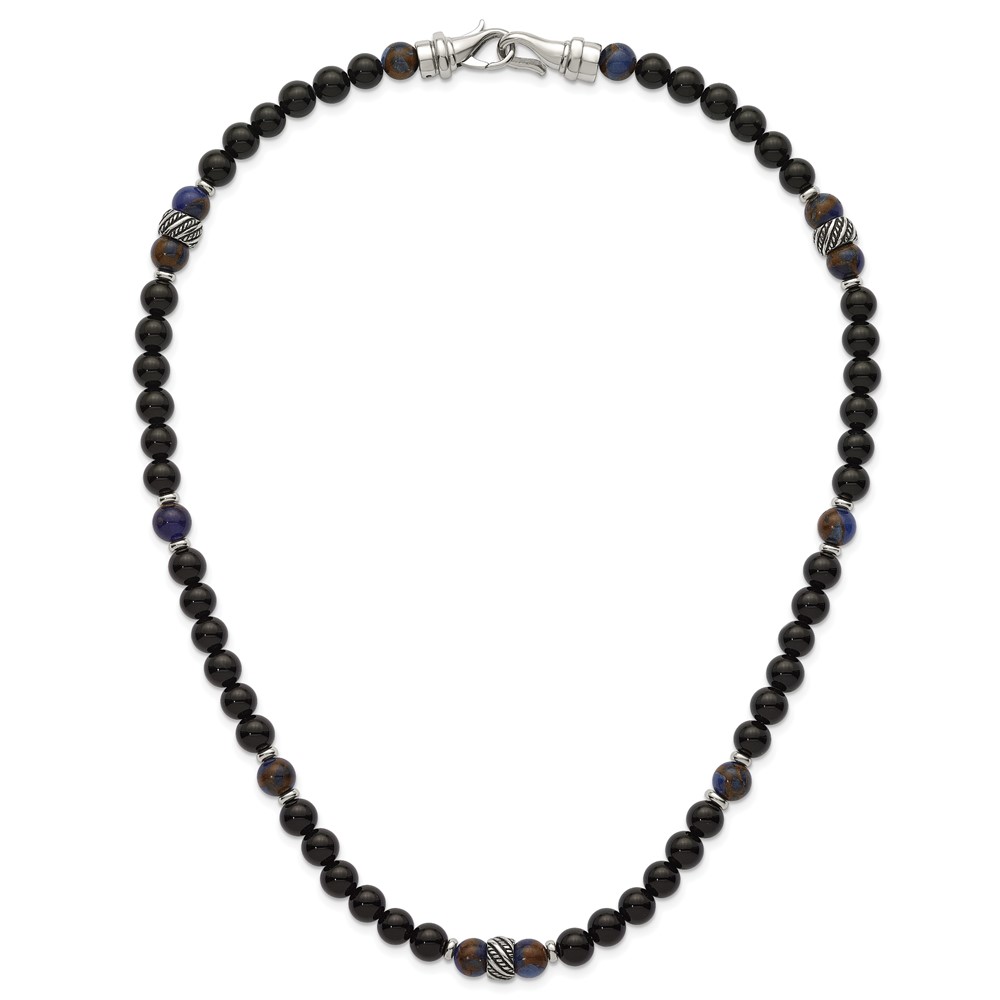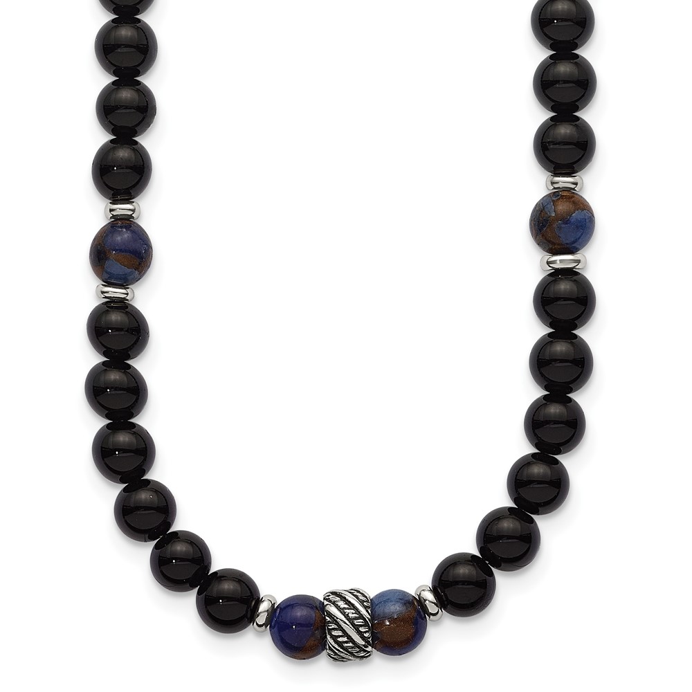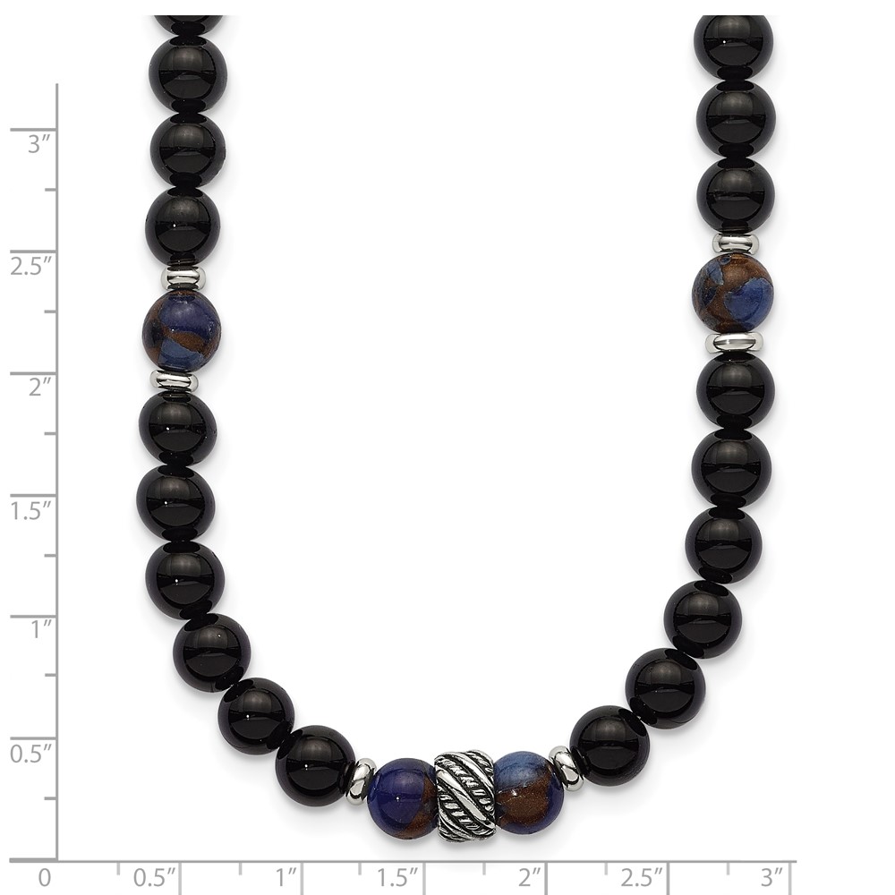 Stainless Steel Polished Antiq Blue Gold/Black Onyx Bead 22in Necklace