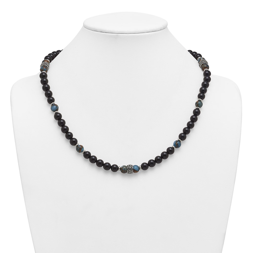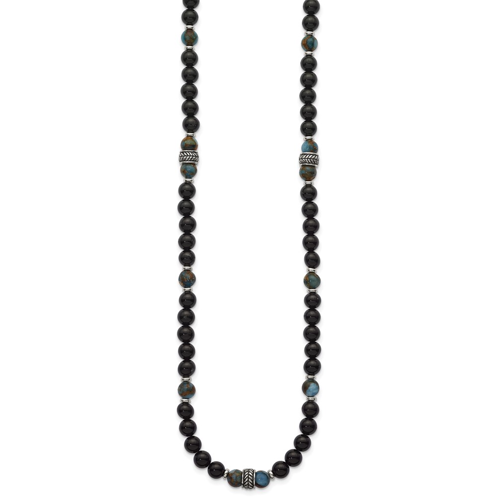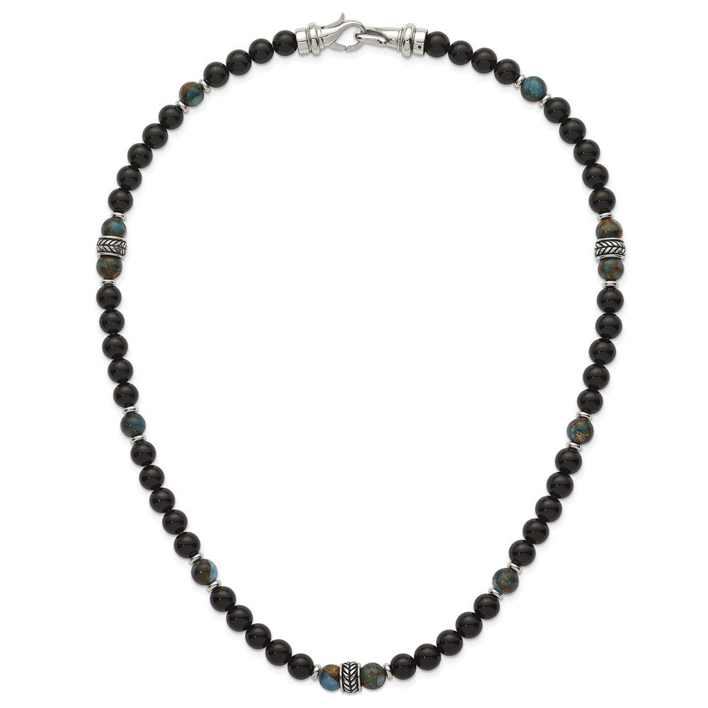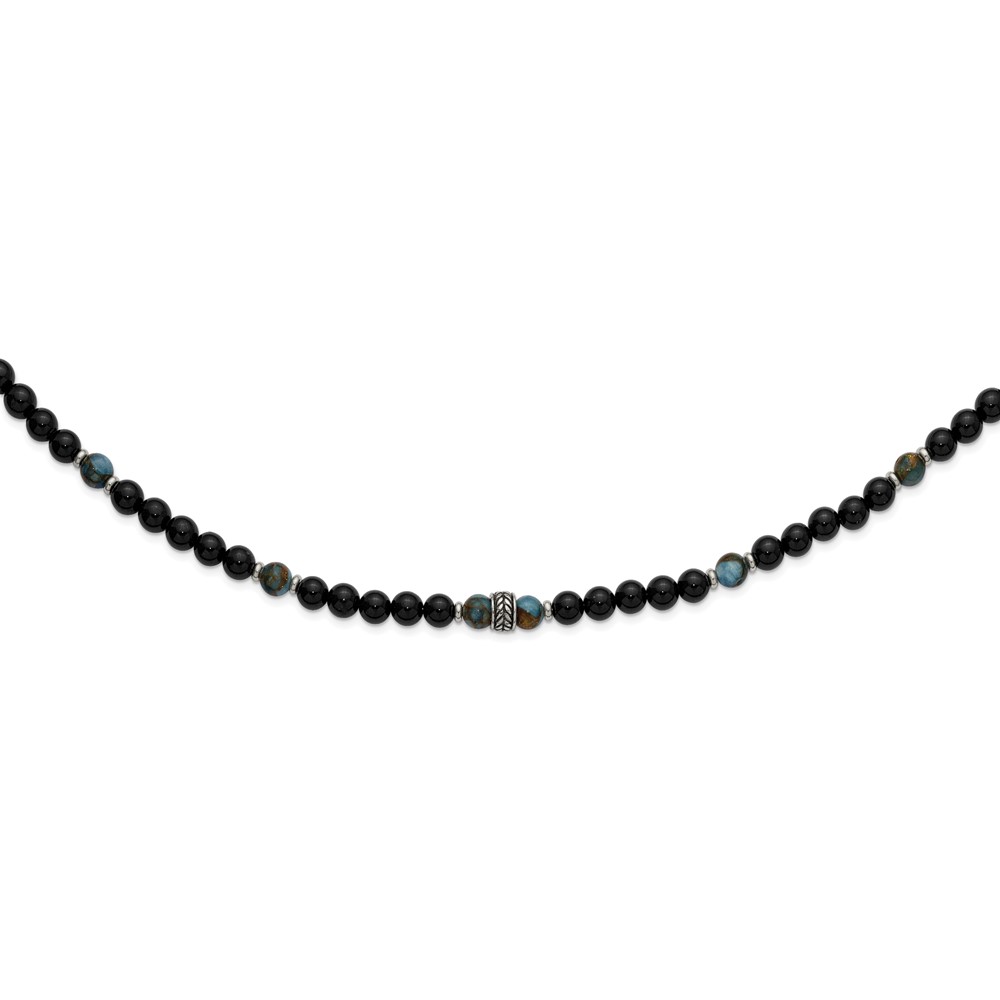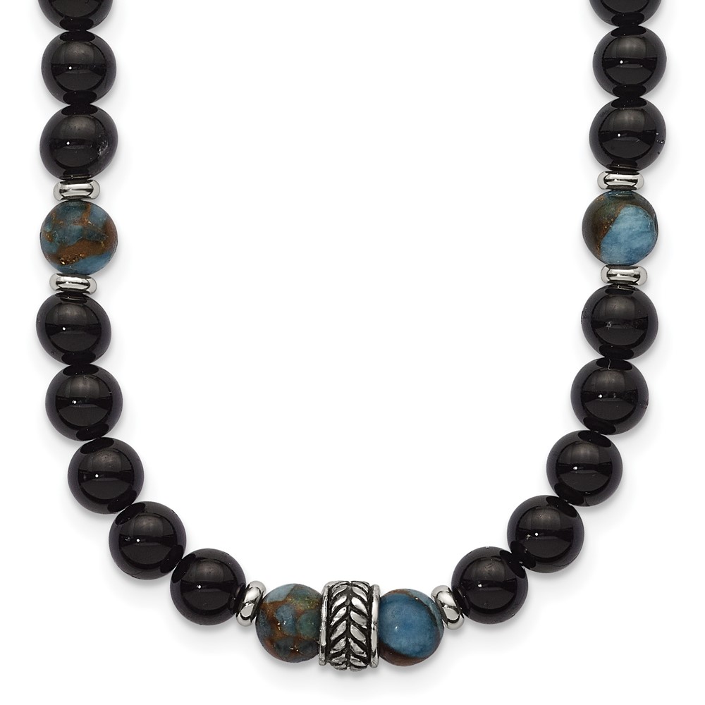 Stainless Steel Polished Antiq Lt Blue Gold/Black Onyx Bead 22in Necklace