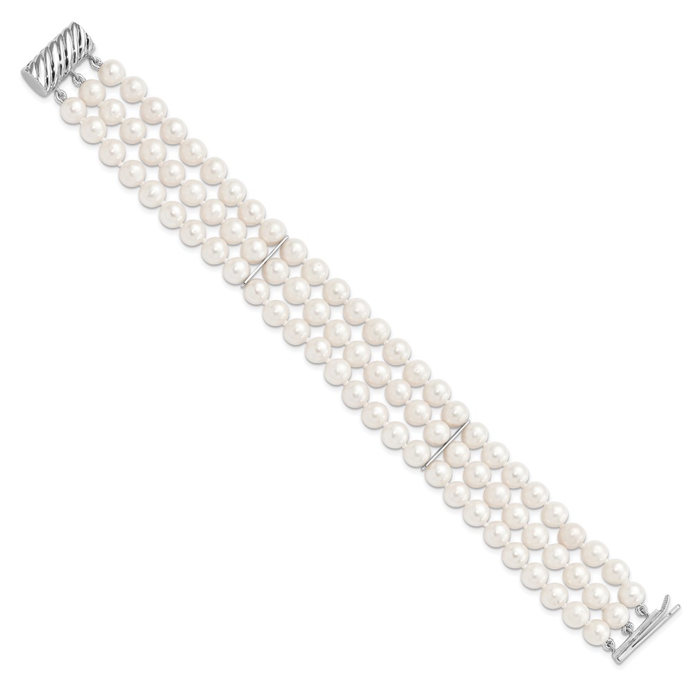 Sterling Silver Rhodium-plated 6-7mm White Near-Round Freshwater Cultured Pearl 3-Strand 7.5 inch Bracelet