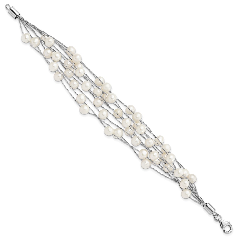 Sterling Silver Rhodium-plated 5-6mm White Semi-Round Freshwater Cultured Pearl Multi Strand 7.25 inch Bracelet