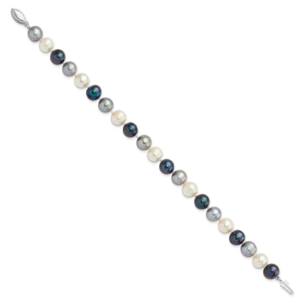 "Sterling Silver Rhodium-plated 8-9mm Black, Green and White Semi-Round Freshwater Cultured Pearl 7.5 inch Bracelet"