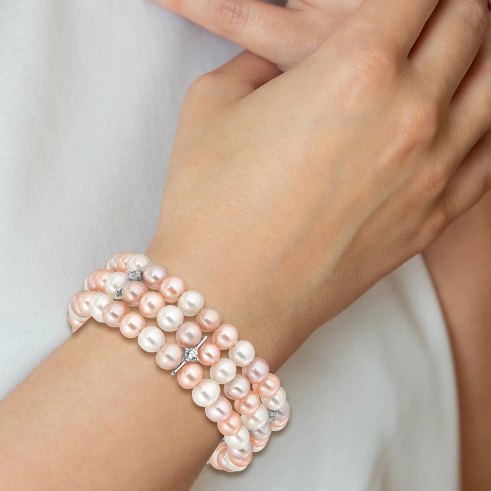 Sterling Silver RH-plated 7-8mm Multi Color FWC Pearl/CZ Flexible Bangle
