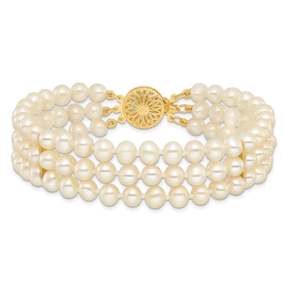 14k 5-6mm White Near-Round Freshwater Cultured Pearl 3-Strand 7.5 inch Bracelet