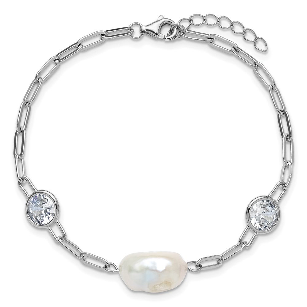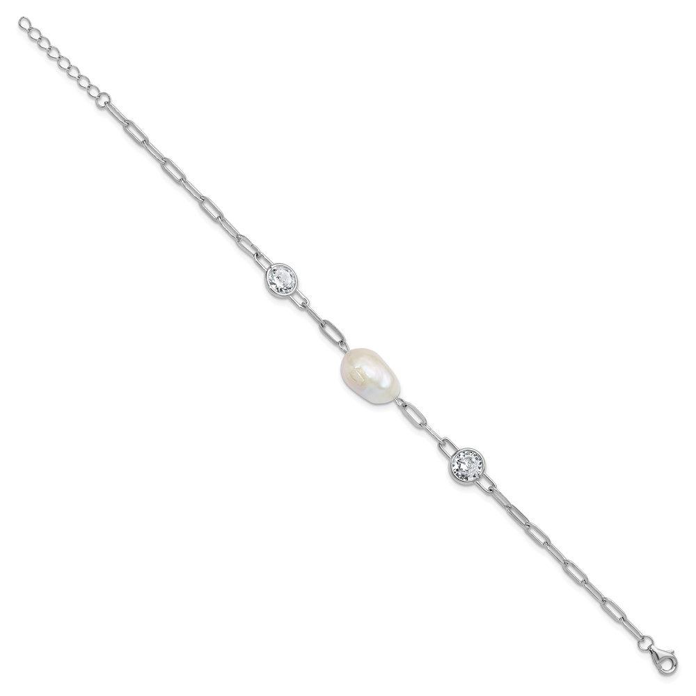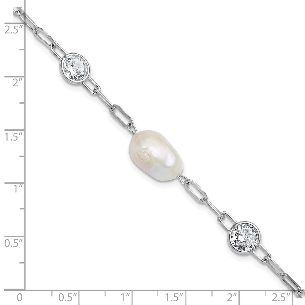 Cheryl M Sterling Silver Rhodium-plated Polished Freshwater Cultured Pearl and CZ Link with .75 Inch Extension Bracelet