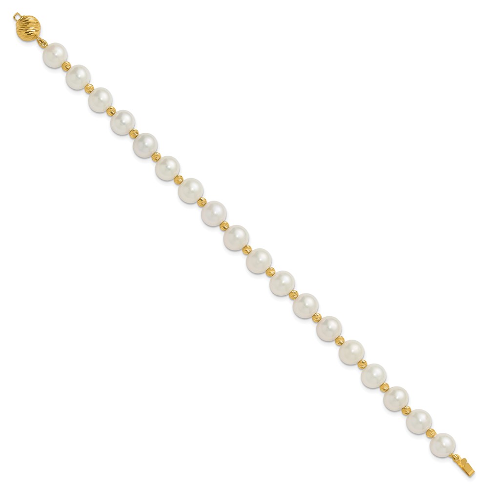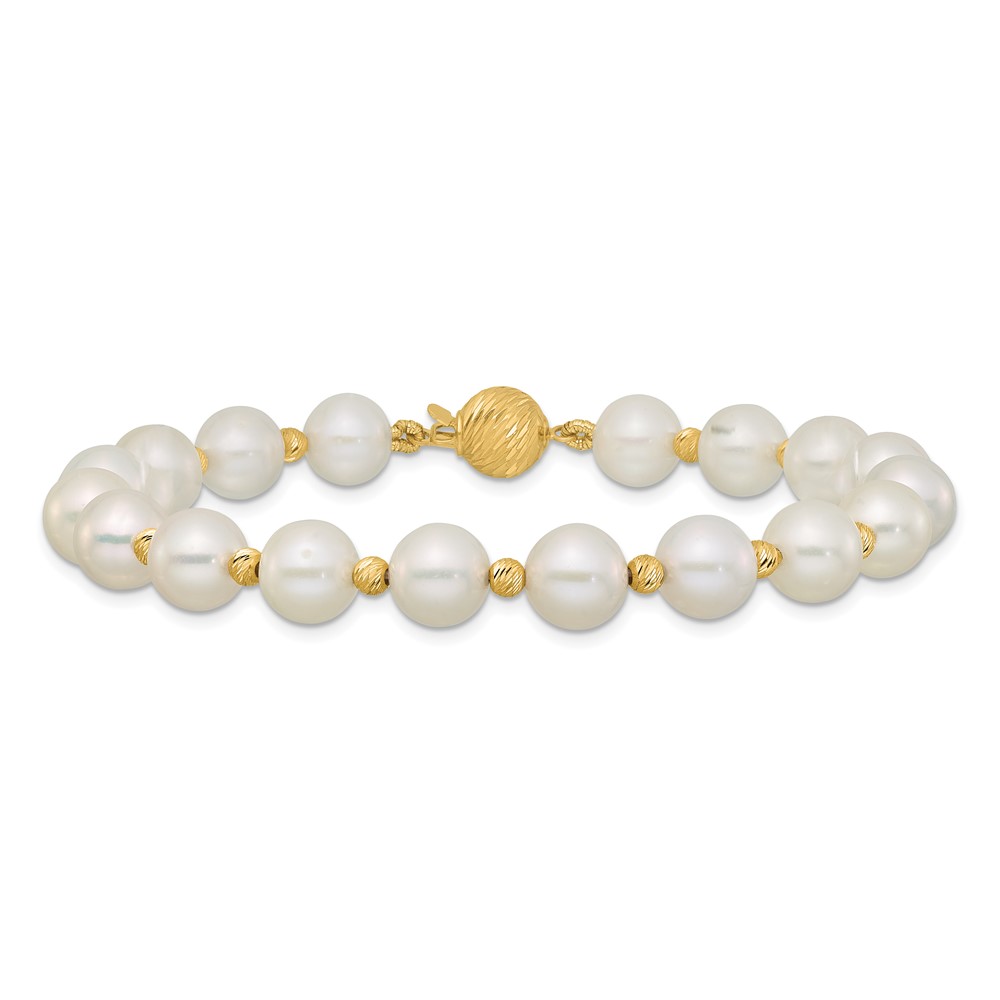 14k 8-9mm White Near-Round Freshwater Cultured Pearl and Diamond-cut Beaded 7.5 inch Bracelet