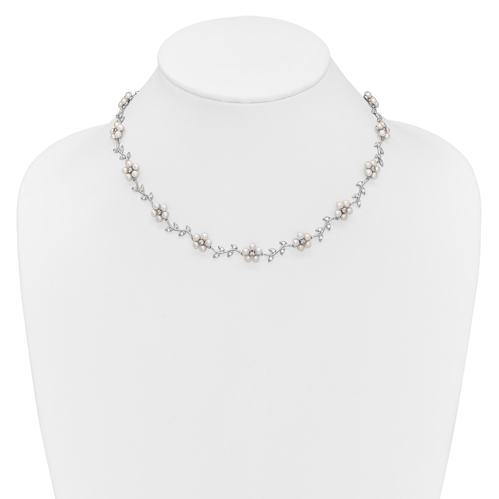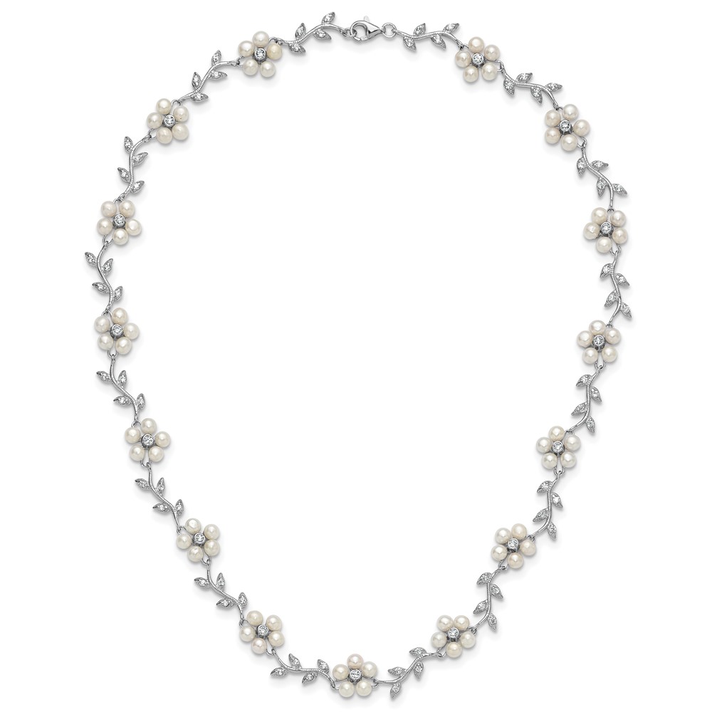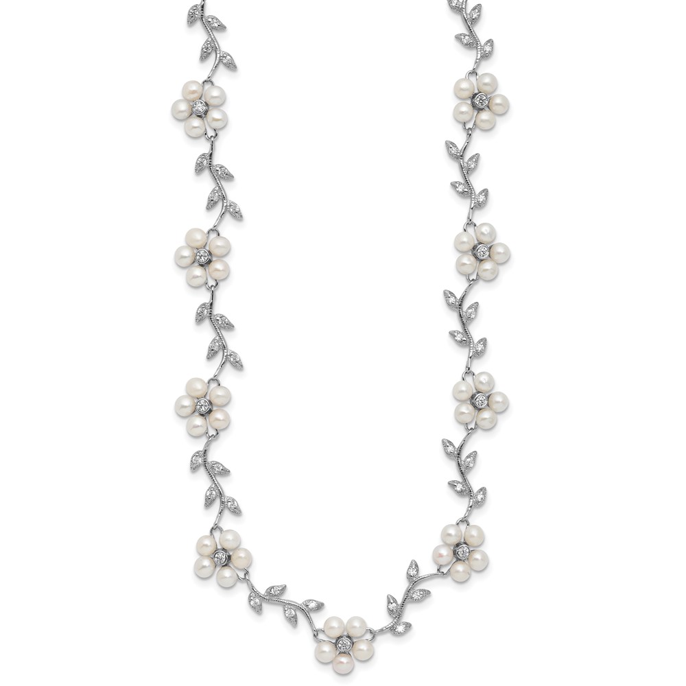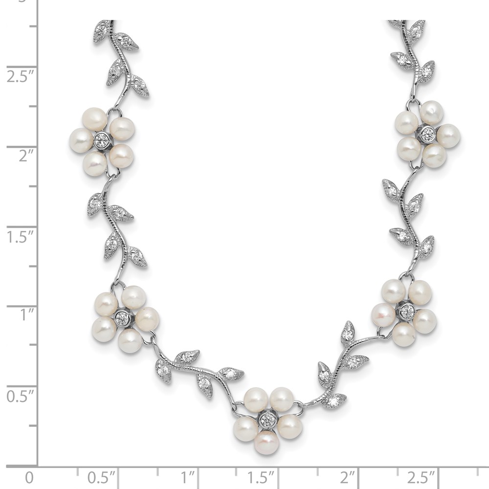 Sterling Silver Rhodium-plated CZ Vine Pattern and Fresheater Cultured Pearl Floral 7 inch Bracelet