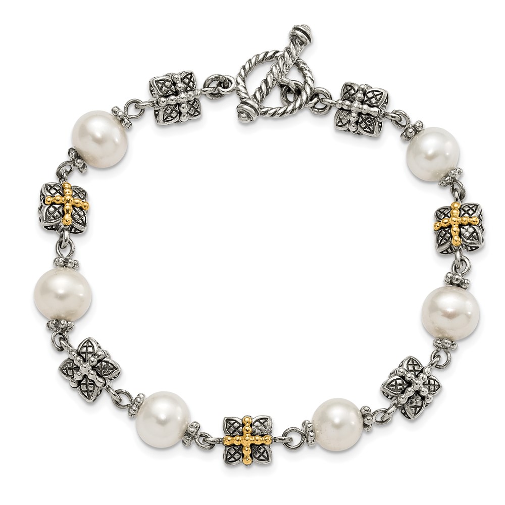 Sterling Silver w/ 14ky Accent Polished & Antiqued Freshwater Cultured Pearl Bracelet