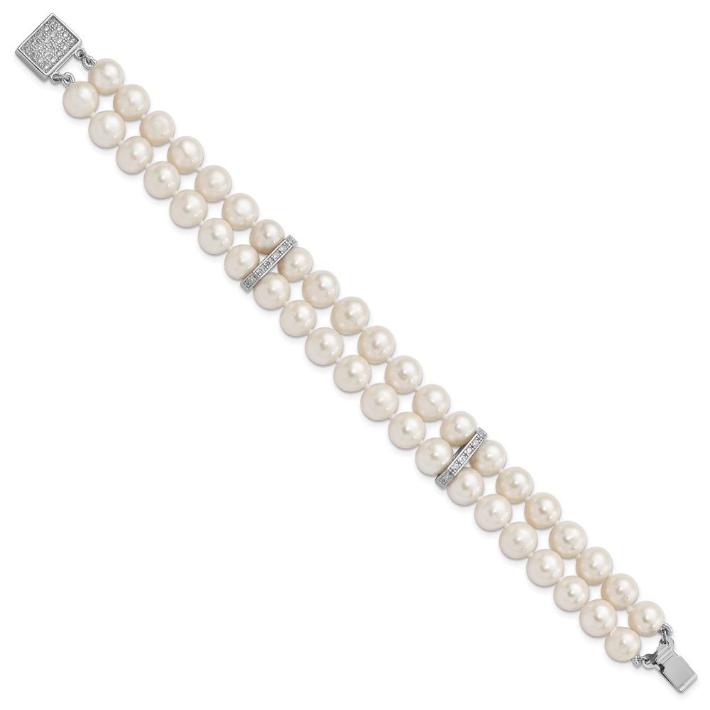 Sterling Silver Rhodium-plated 7-8mm White Near-round Freshwater Cultured Pearl and CZ 2-Strand 7 inch Bracelet