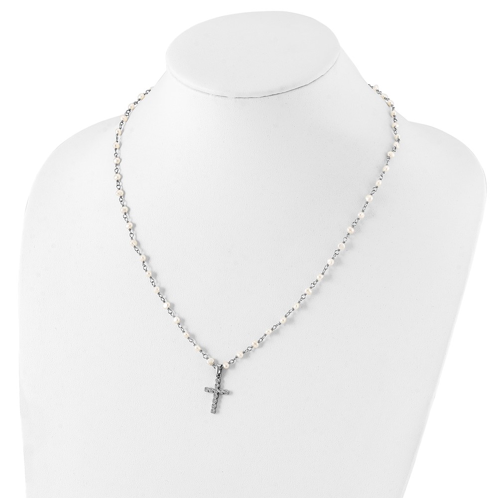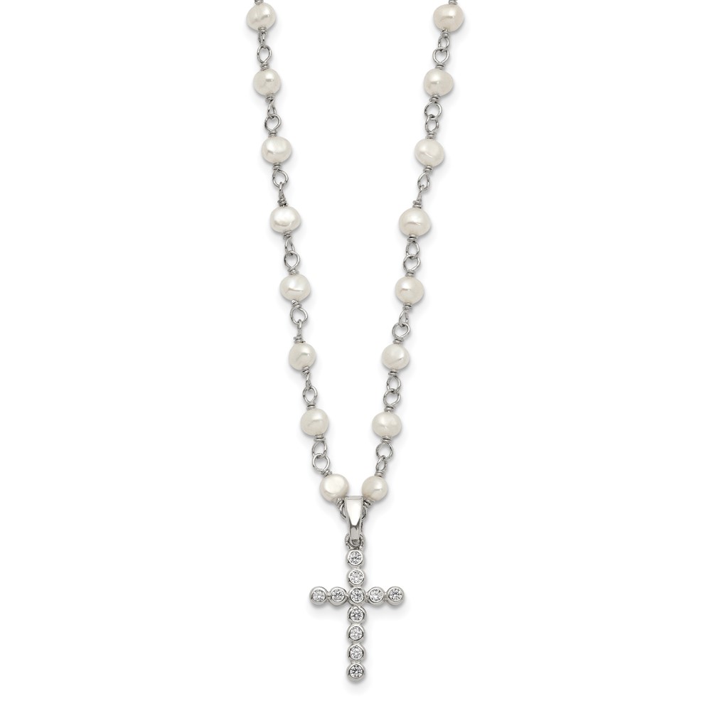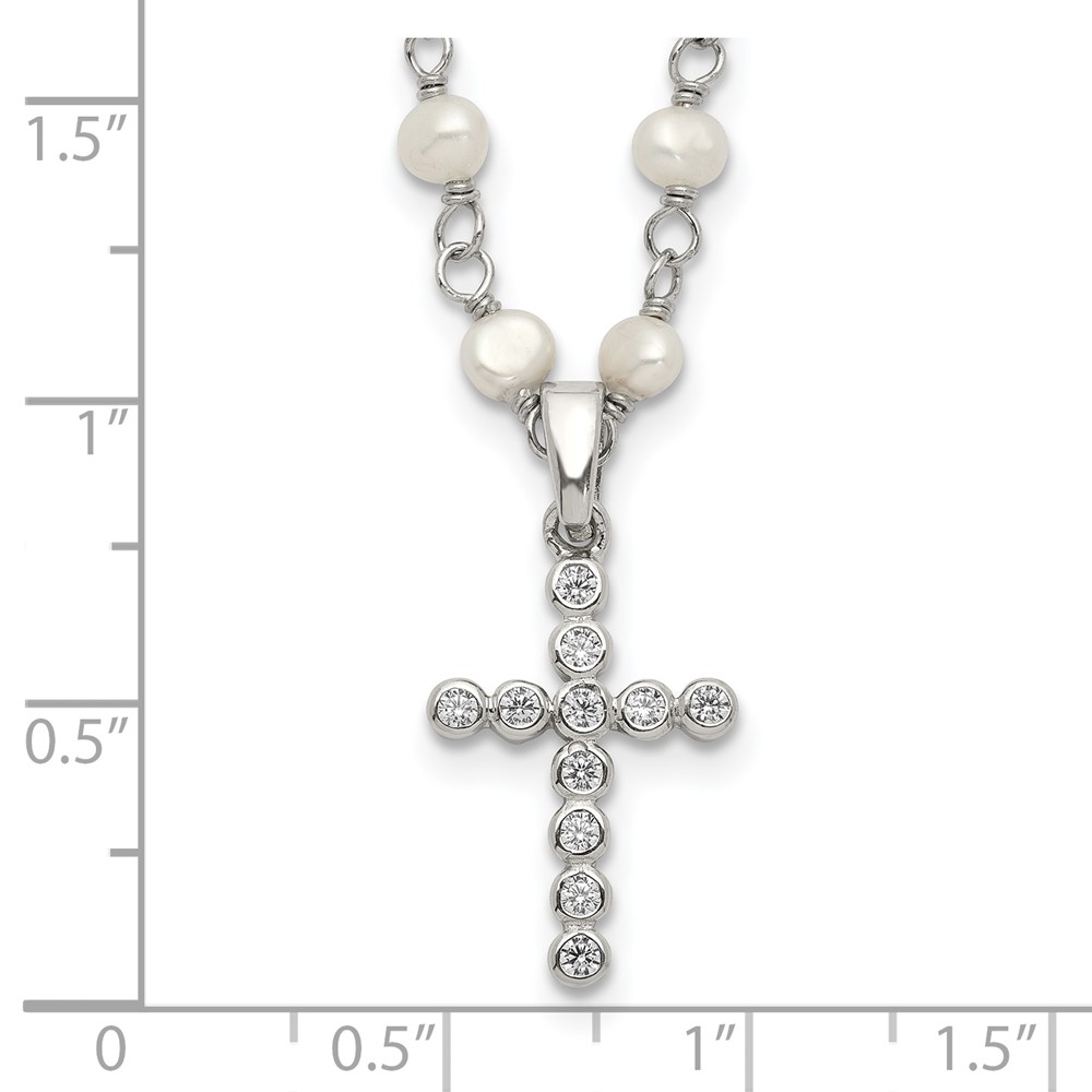 Sterling Silver Rhodium-plated 4-5mm White Near-Round Freshwater Cultured Pearl and CZ Cross 21 inch Necklace