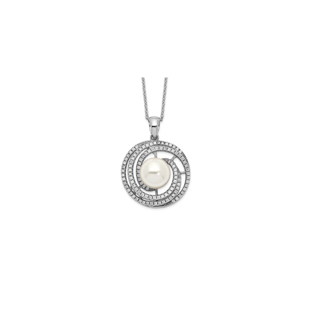 Sterling Silver Majestik Rh-plated 10-11mm Imitat Shell Pearl CZ Necklace