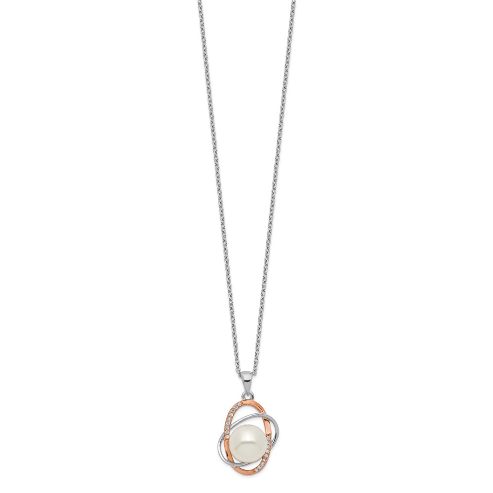 Sterling Silver Rhodium-plated Rose-tone 18k Flash Gold-plated 9-10mm White Button Freshwater Cultured Pearl and CZ 17 inch Necklace