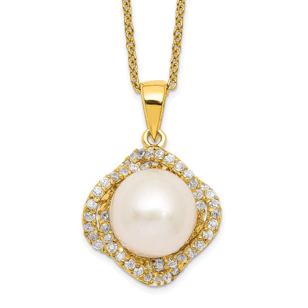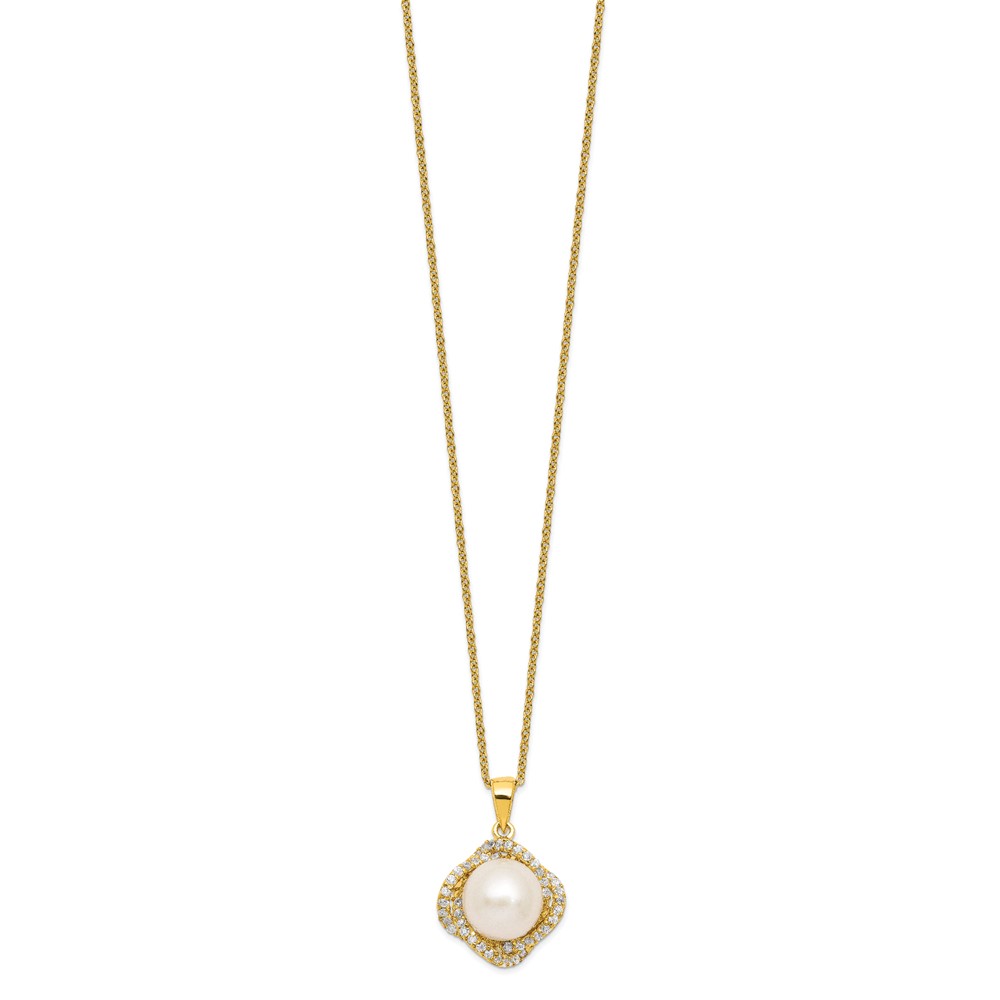 Sterling Silver Gold-plated Fancy Gallery FWC Button Pearl & CZ Necklace