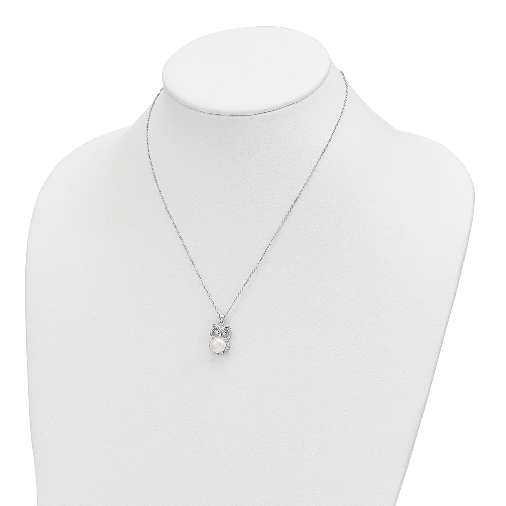 Sterling Silver Rhodium-plated 8-9mm White Button Freshwater Cultured Pearl and CZ Owl 17 inch Necklace