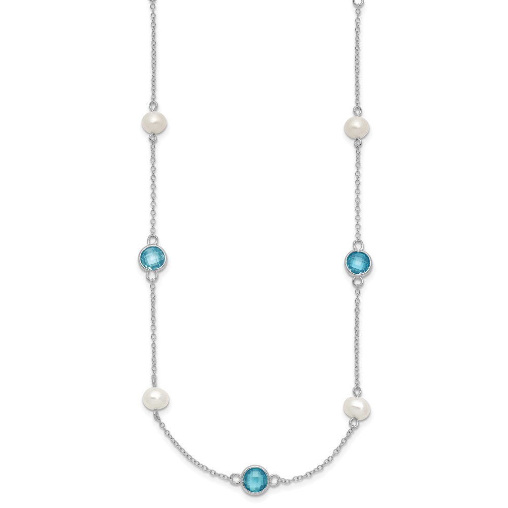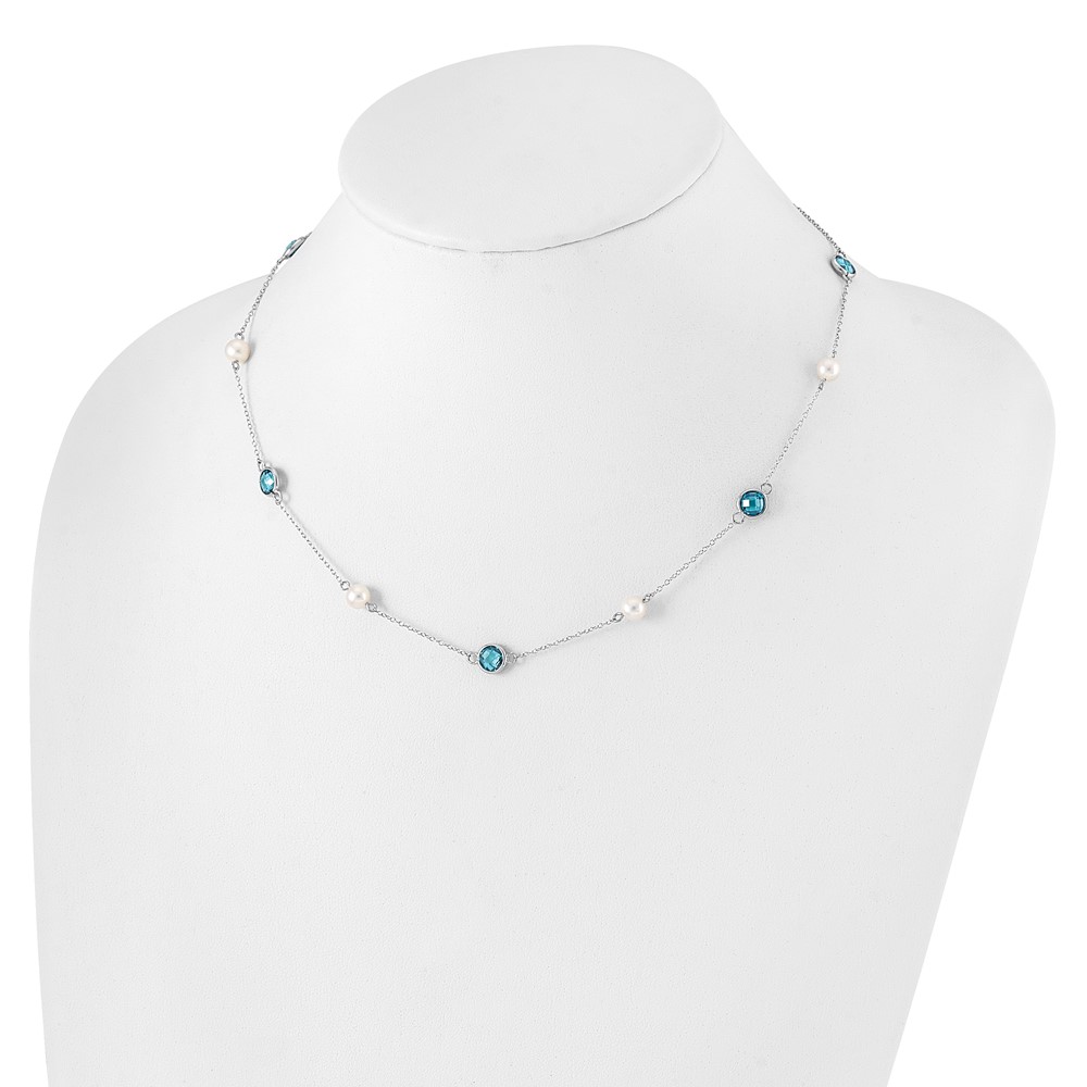 Cheryl M Sterling Silver Rhodium-plated Blue Double Pineapple-cut CZ & White Freshwater Cultured Pearl 9 Station 18 Inch Necklace with 2 Inch Extender