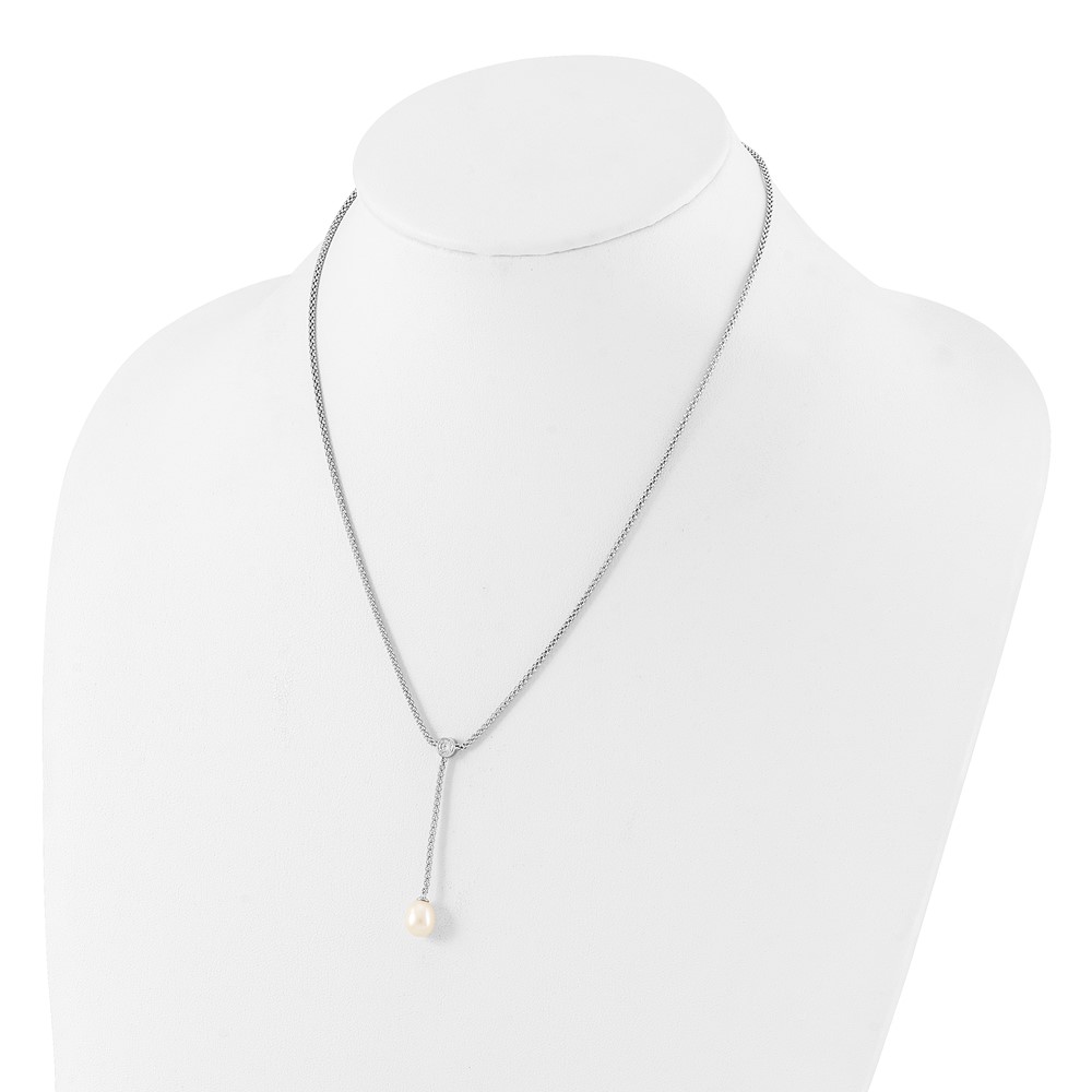 Sterling Silver Rhodium-plated 8-9mm Teardrop Freshwater Cultured Pearl and CZ Drop Dangle 18 inch Necklace