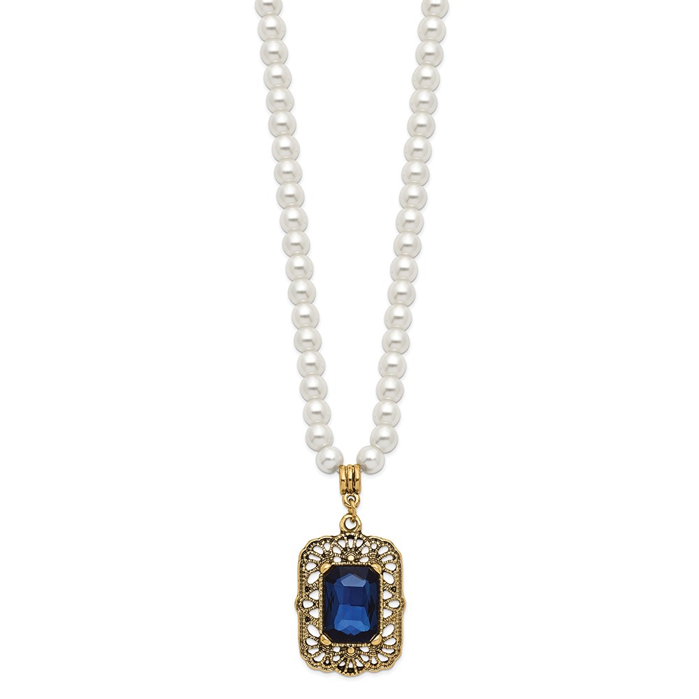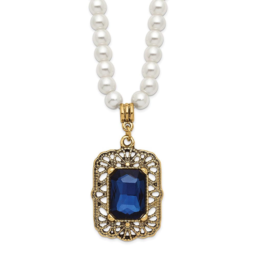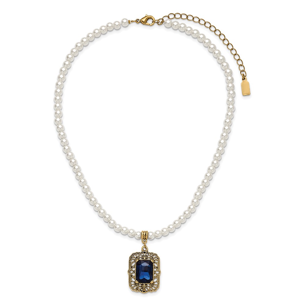 1928 Gold-tone Blue Crystal and Imitation Pearl 15 inch with a 3 inch Extender Drop Pendant Necklace