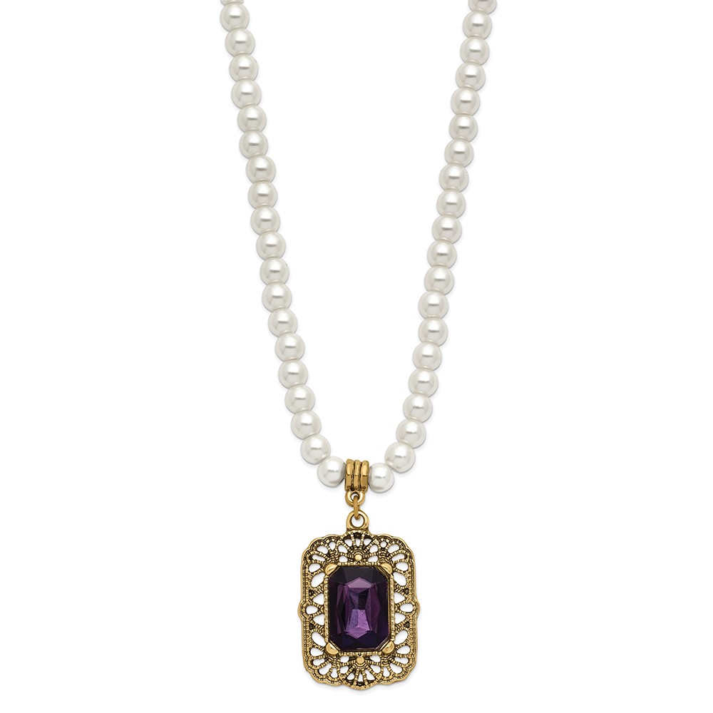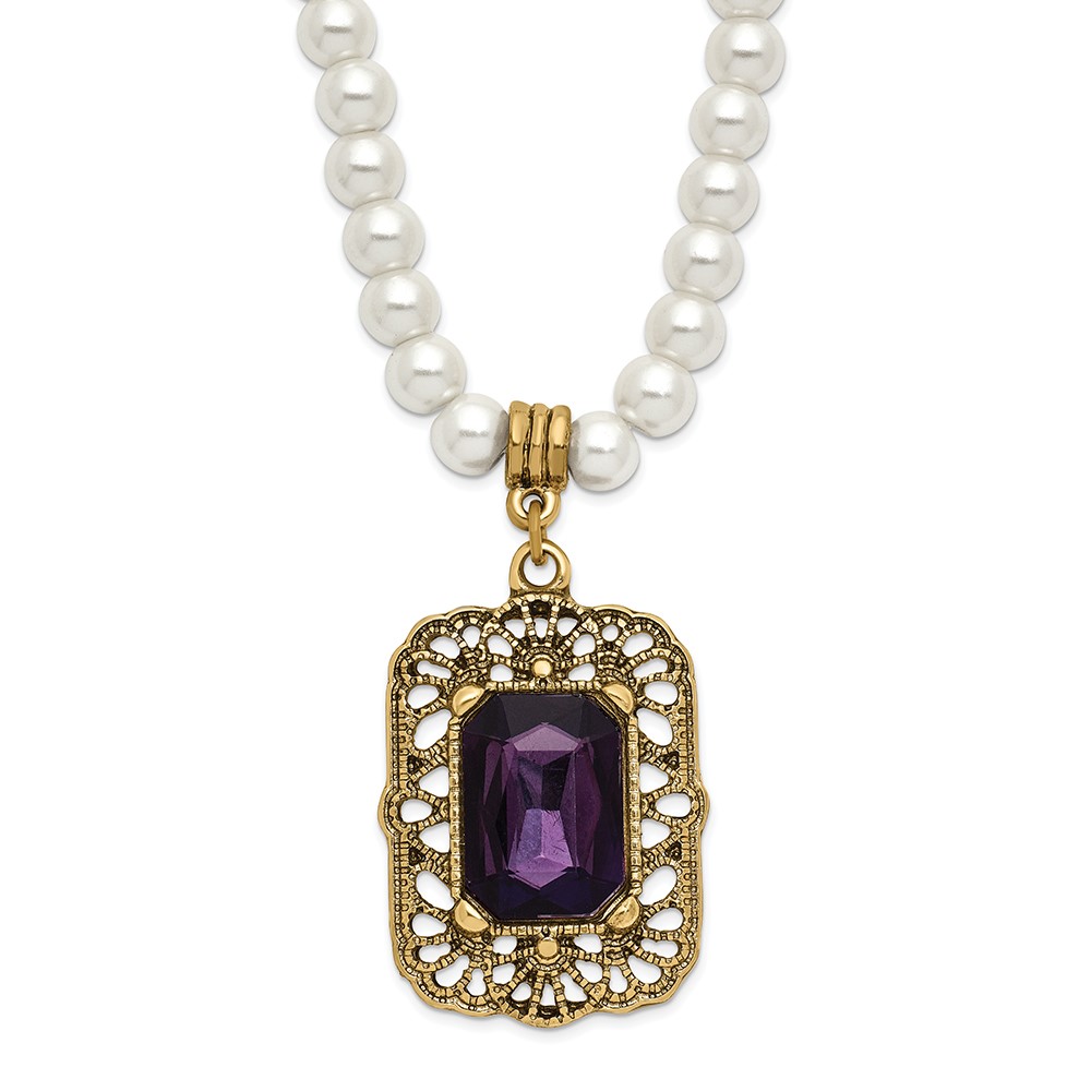 1928 Gold-tone Purple Crystal and Imitation Pearl 15 inch with a 3 inch Extender Drop Pendant Necklace