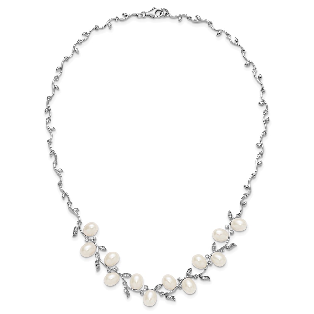 Sterling Silver Rhodium-plated 6-8mm Teardrop White Freshwater Cultured Pearl and CZ Leaf 17 inch Necklace
