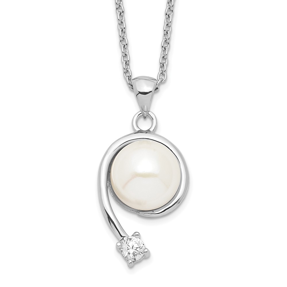 Sterling Silver Rhodium-plated 8-9mm White Button Freshwater Cultured Pearl and CZ 17 inch Necklace