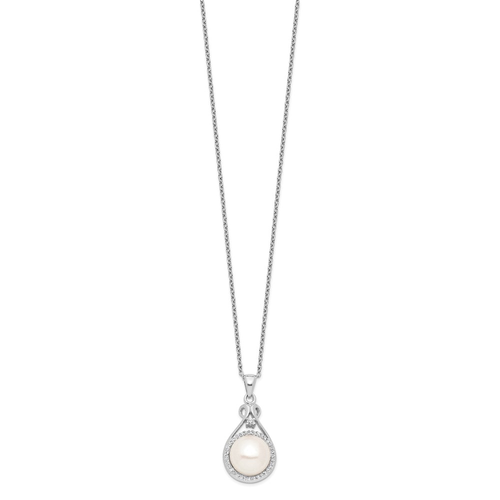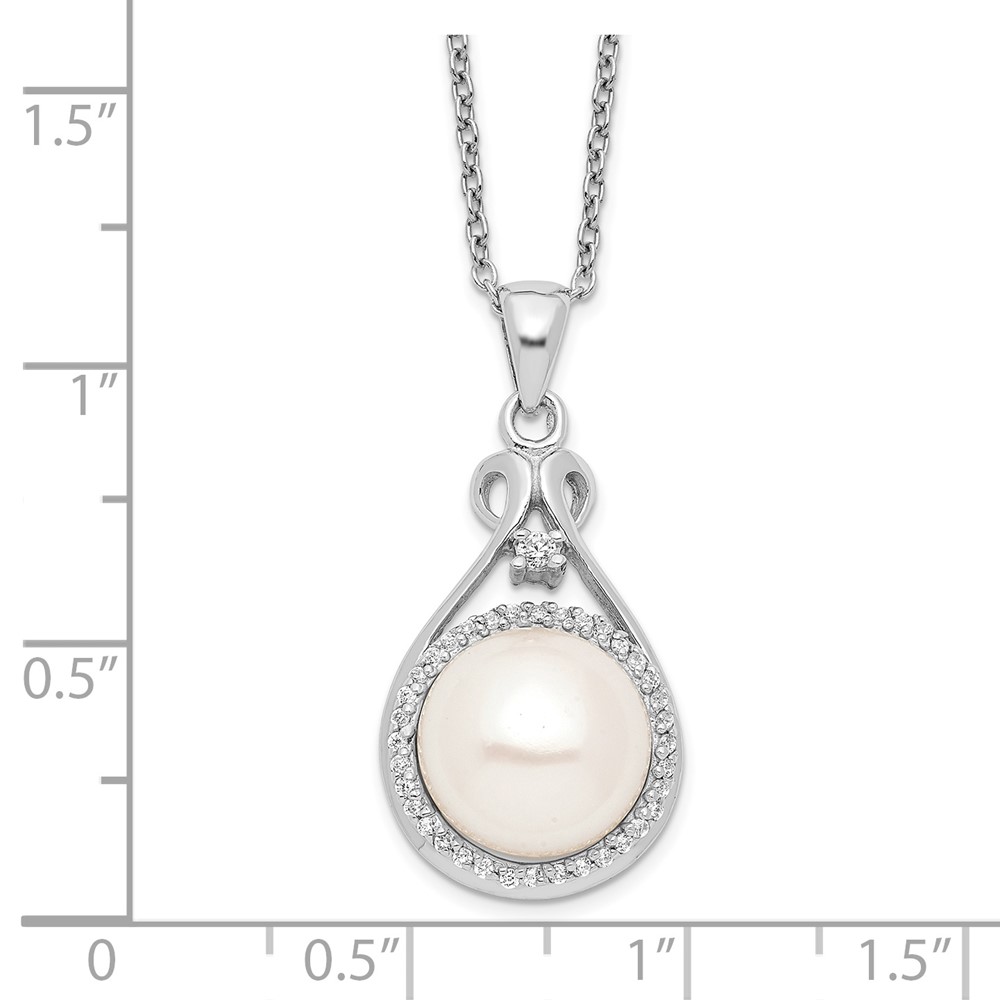 Sterling Silver Rhodium-plated 10-11mm White Button Freshwater Cultured Pearl and CZ 17 inch Necklace
