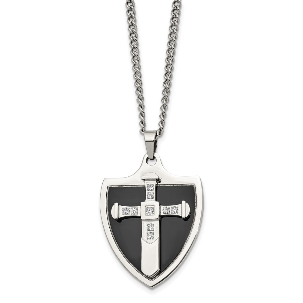 Chisel Stainless Steel Polished Black IP-plated with CZ Cross Shield Pendant on a 24 inch Curb Chain Necklace