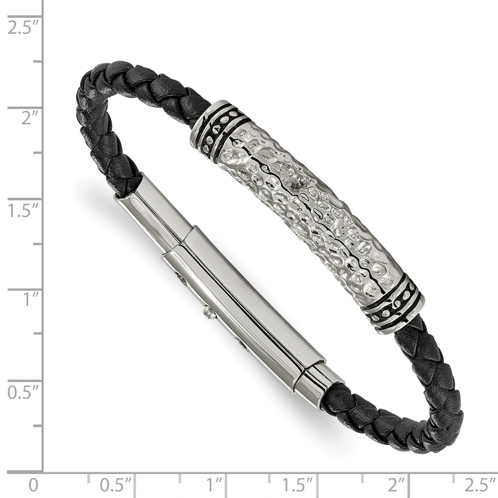 Chisel Stainless Steel Antiqued Polished and Hammered Black Braided Leather Adjustable 7.5 to 8 inch Bracelet